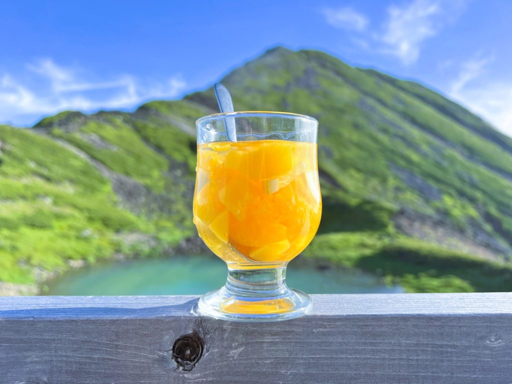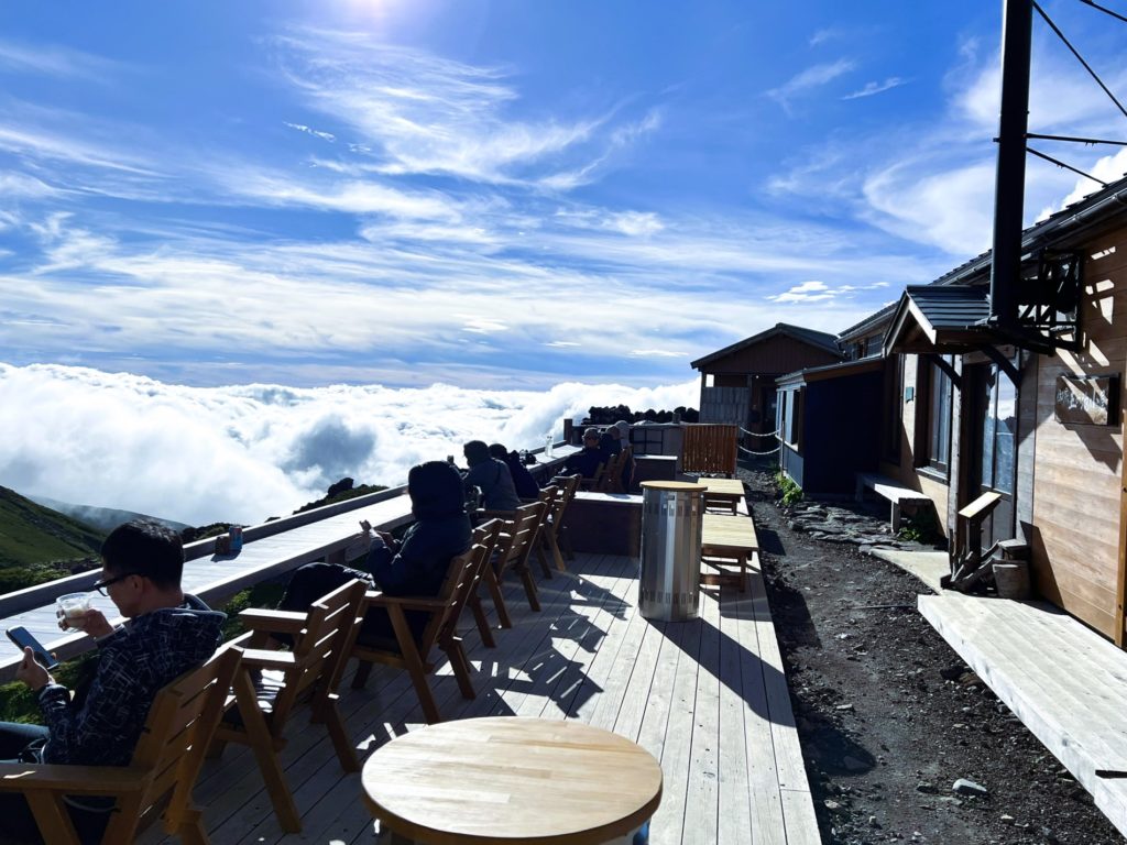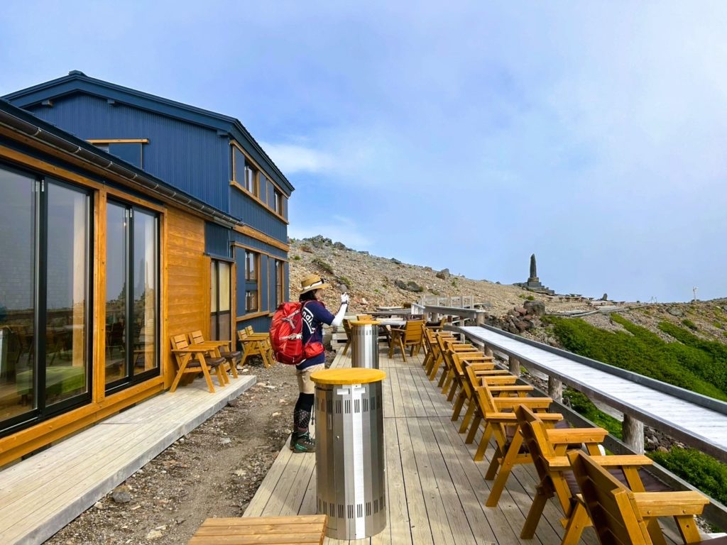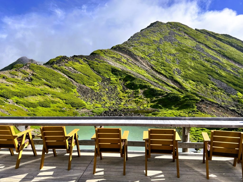 テラスからは、エメラルドグリーンに輝く五の池を挟み、摩利支天山(まりしてんやま)の雄大な山容が広がります。