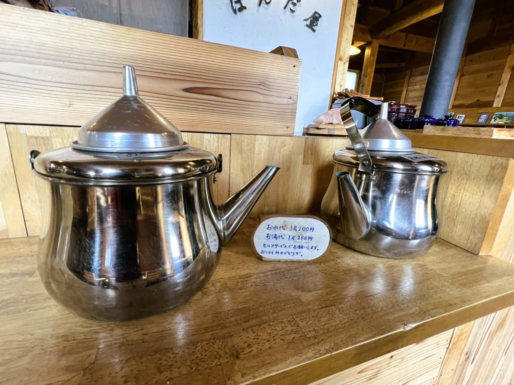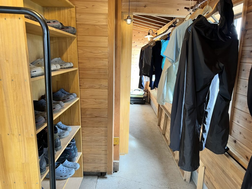 売店商品棚奥の通路が乾燥スペースと靴置場になっていて、外履きサンダルもこちらです。