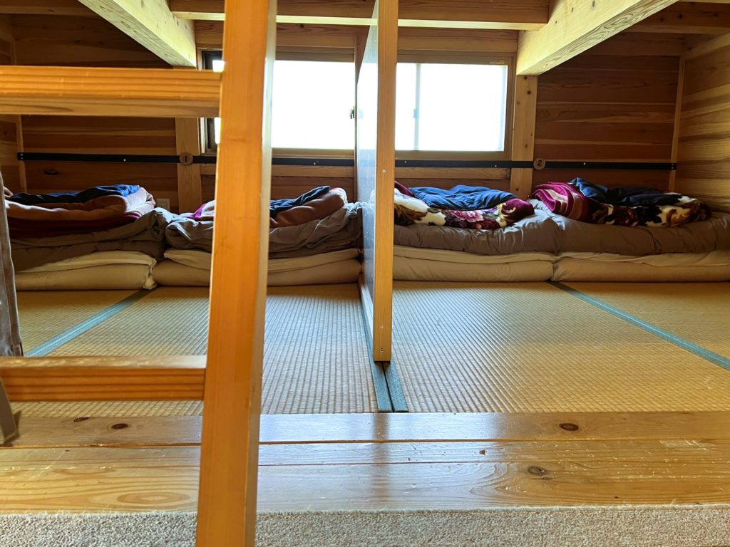 2段式の寝床が通路にズラッと並んでいます。