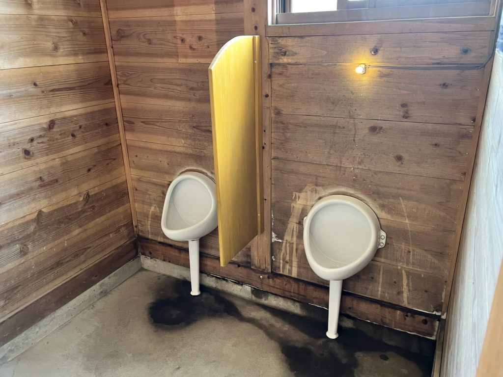 カーテンに仕切られたところに、男性用の小便器が2つ。