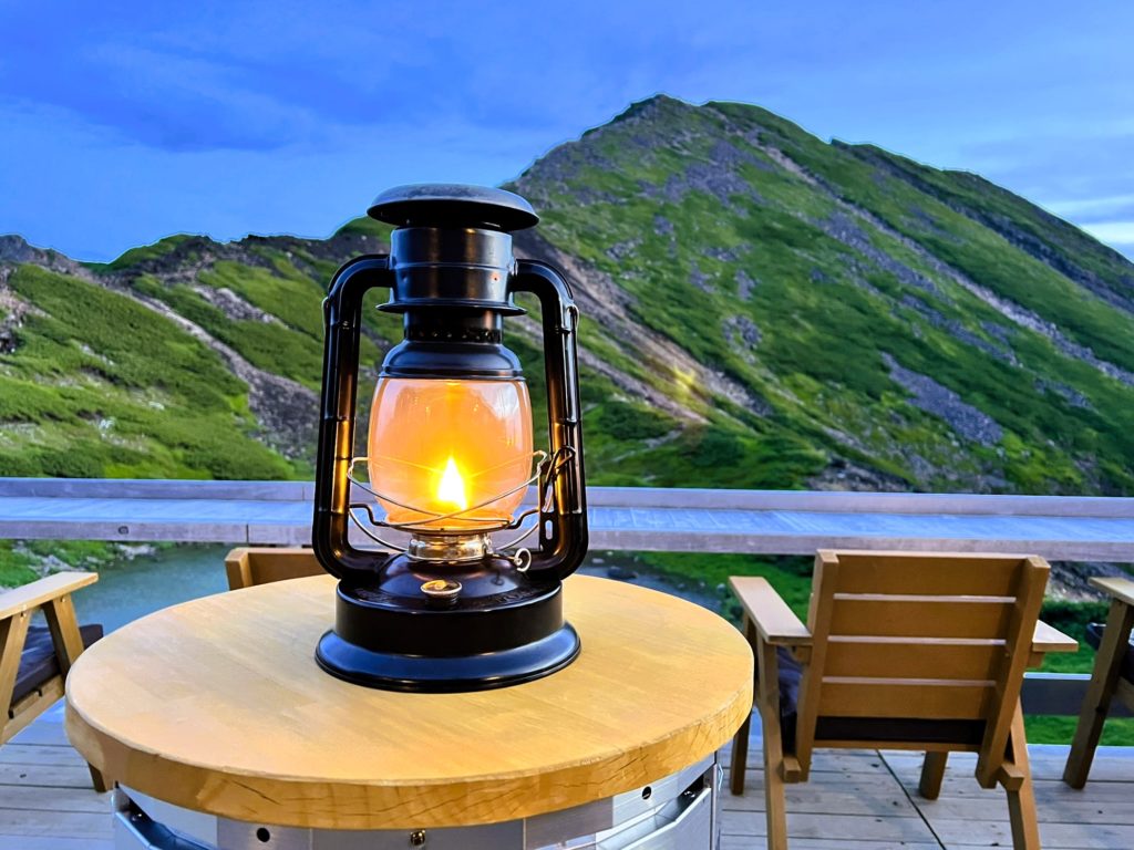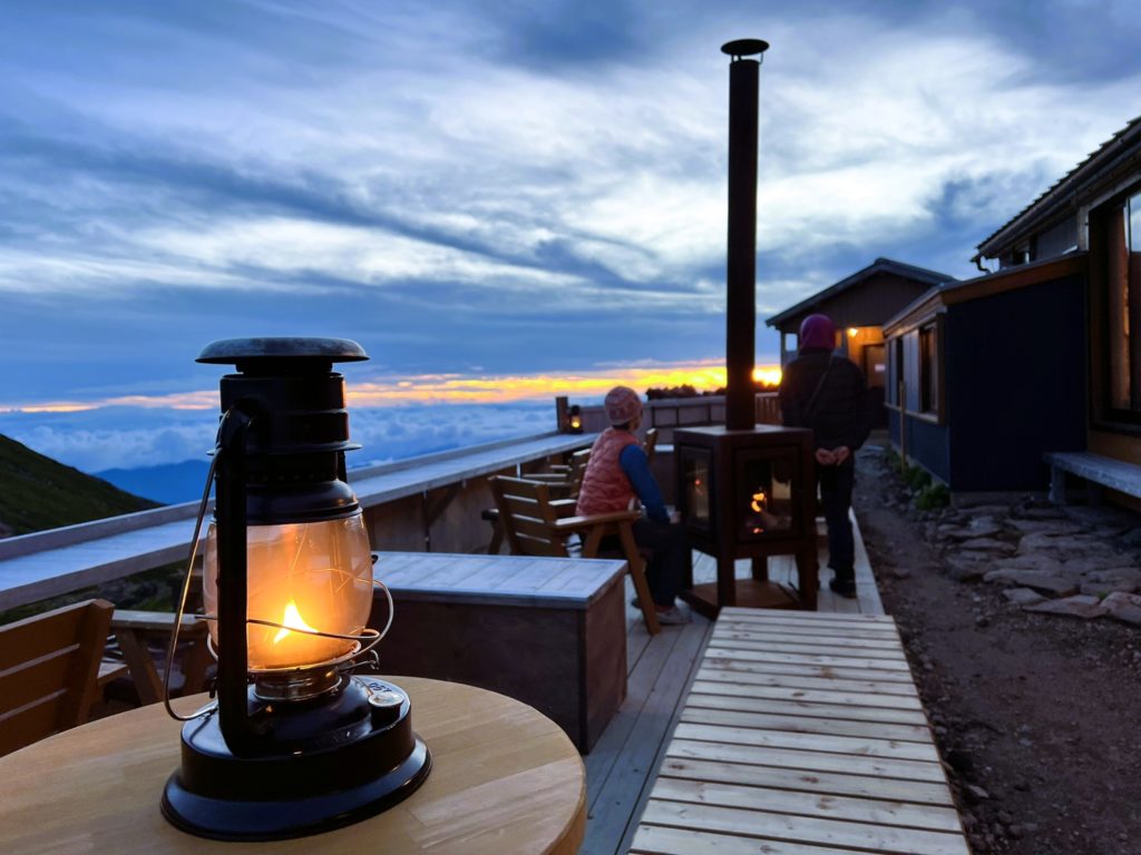 テラスにはランプや薪ストーブが灯り始め、夕陽に染まる山小屋を更にドラマチックに仕上げていきます。