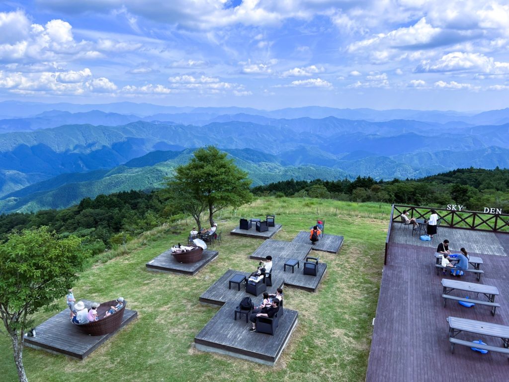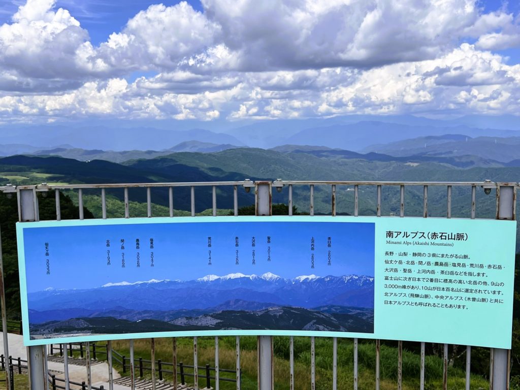 360度ぐるりと見渡せる大パノラマが広がり、東側には南アルプス赤石山脈を望めます。