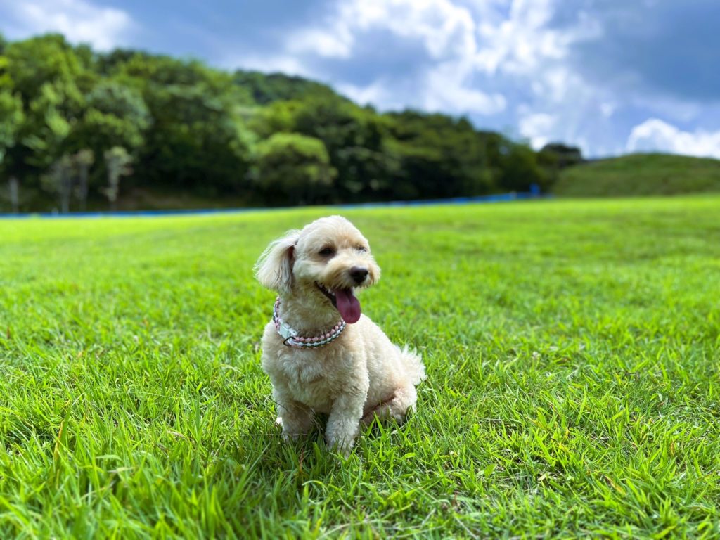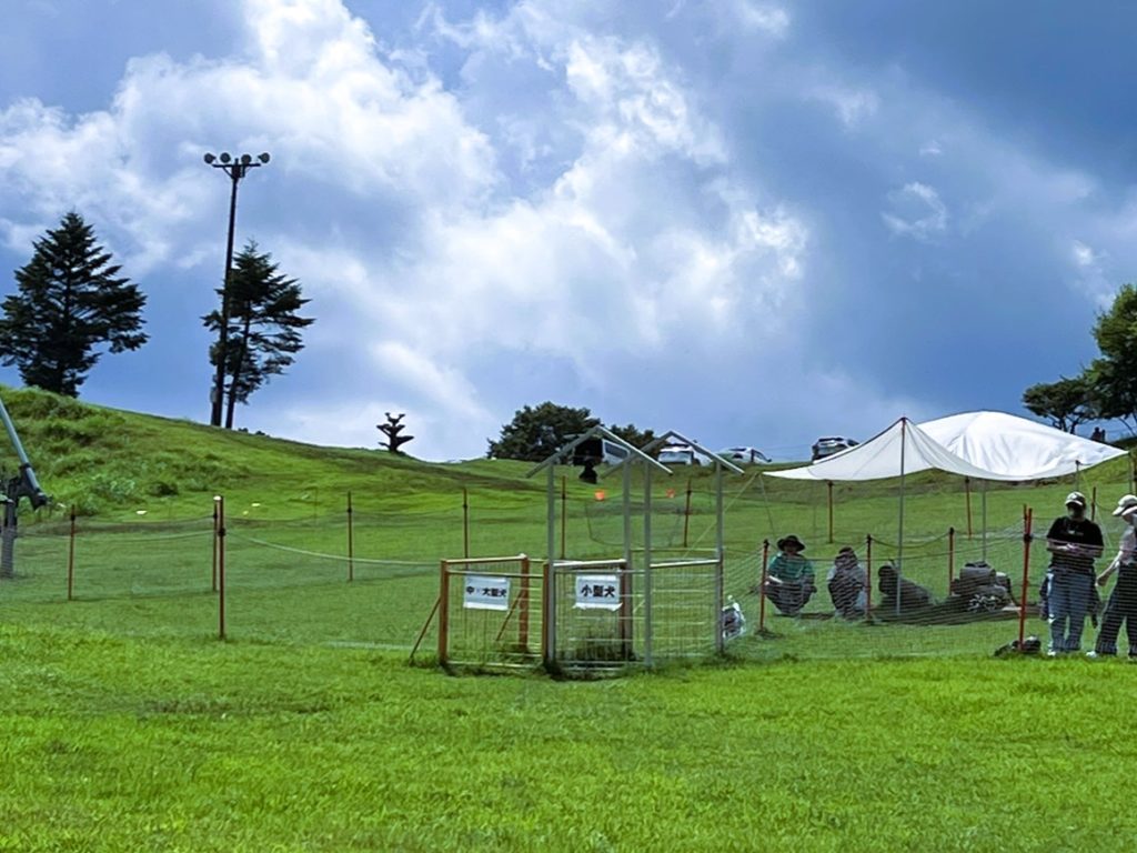 鮮やかなグリーンが眩しい芝生の中に、ドッグランがありました。