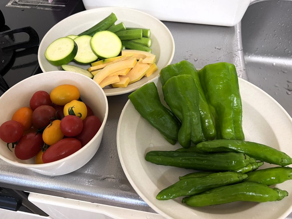 来る途中に立ち寄った『道の駅どんぐりの里いなぶ』で購入した新鮮野菜もいただきます♪