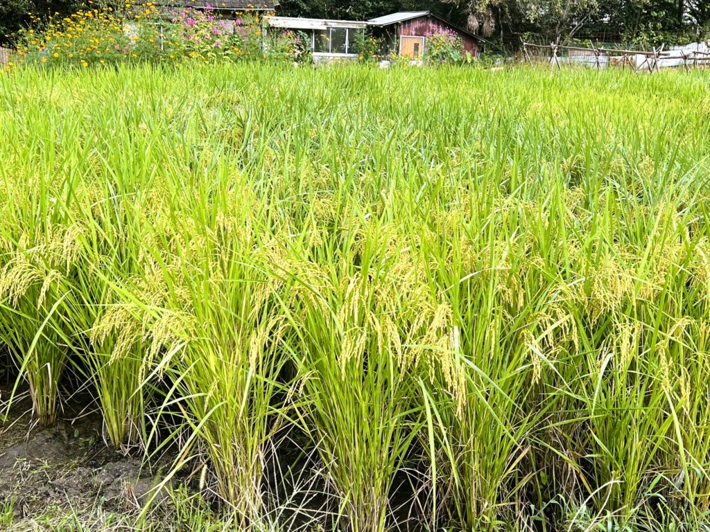 神社やお堂があり、田んぼには青々とした稲穂が実っています。