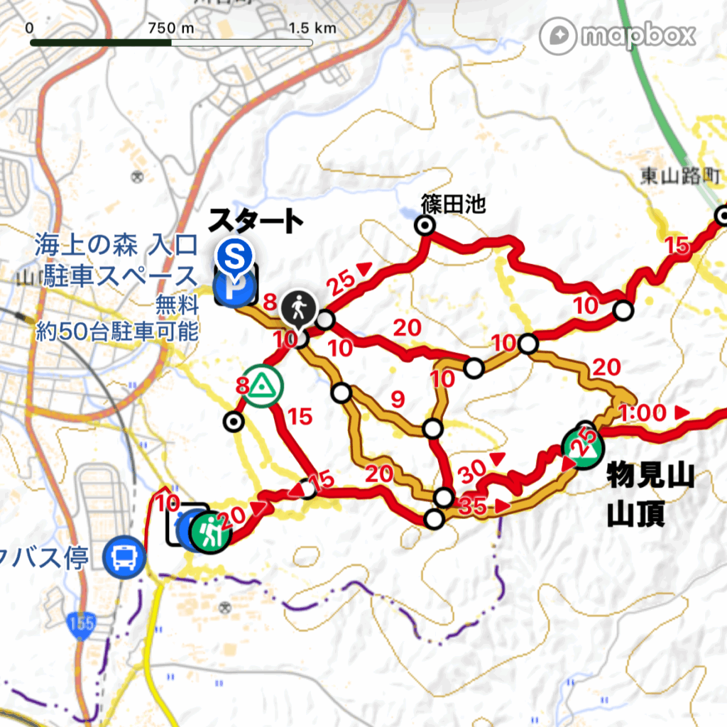 『海上の森駐車スペース』からの周回コースをご紹介します。※オレンジ色の線です