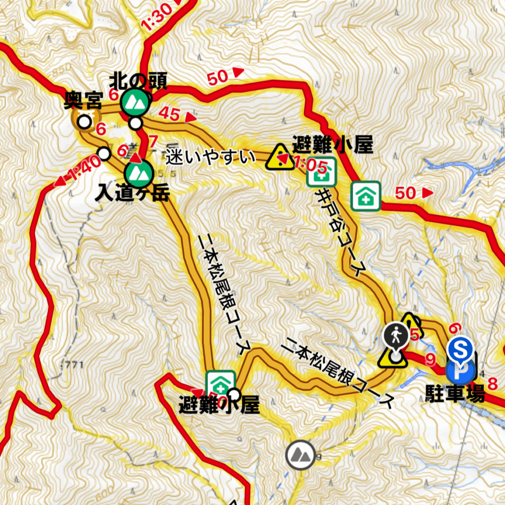 駐車場→井戸谷コース→北の頭→奥宮→入道ヶ岳→二本松尾根コース→駐車場