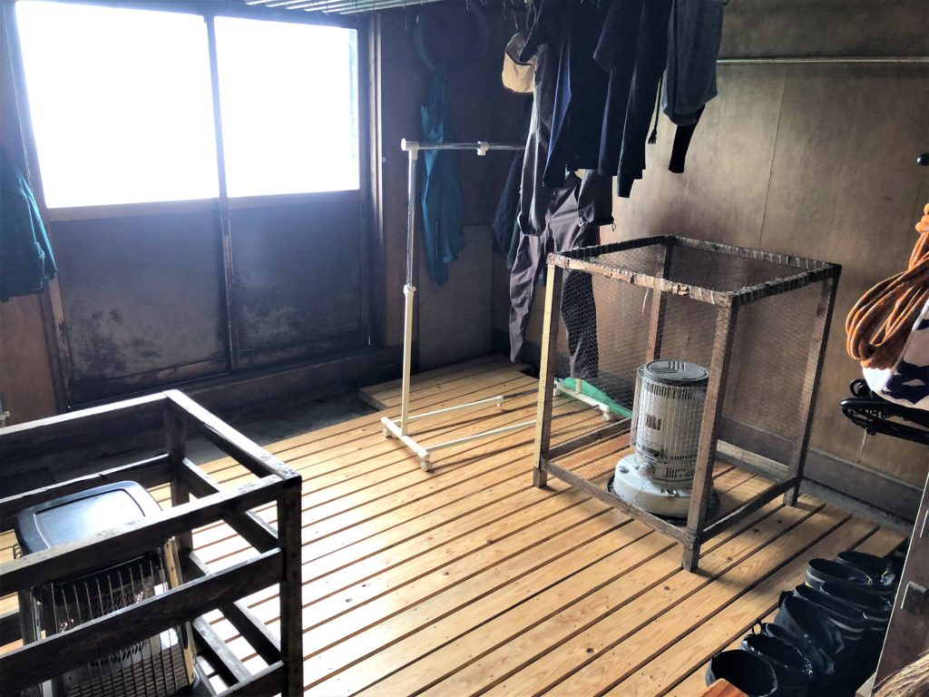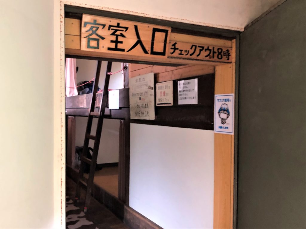 通路の両側が上下2段の部屋になっていて、1スペースは、布団4枚がゆったりと広げられるくらいの広さです。女子トイレ内には更衣室もありますが、部屋にはカーテンが付いているので、同性の相部屋の場合は、着替えも可能ですね。消灯は、21:00頃です。
