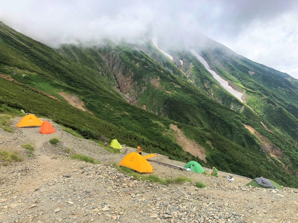 人気のテント場は、山荘のすぐ近くにあります。最大で50張。五竜岳と夕陽がきれいに見える西側の斜面です。