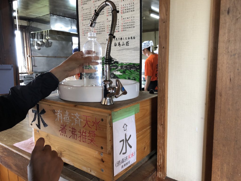 飲料水は、食堂でもらえます。ペットボトルや水筒を持参すれば好きなだけもらえます。消毒済みの天水なので、少し味が気になる人もいるかもしれません。「煮沸推奨」と書かれていました。