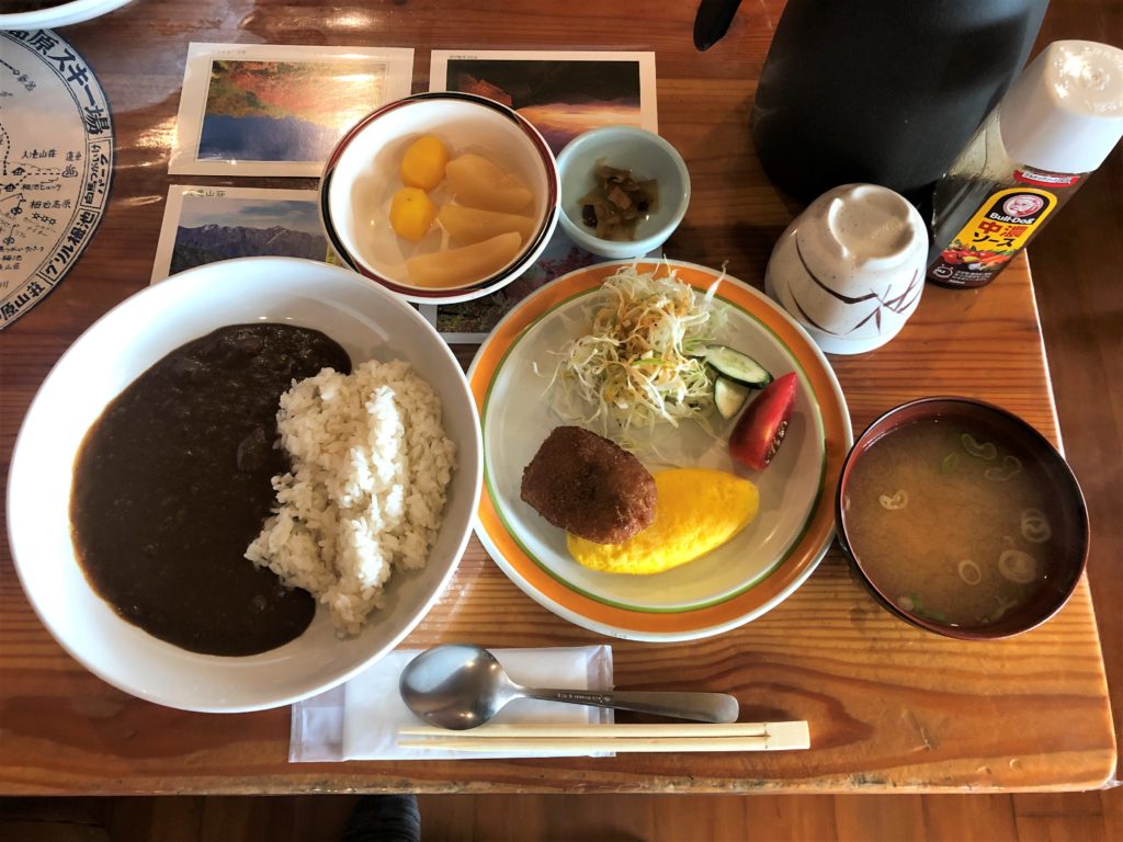 夕食のメニューは、カレーにオムレツ。デザートが付いているのが嬉しいですね。この日は、栗と桃でした。