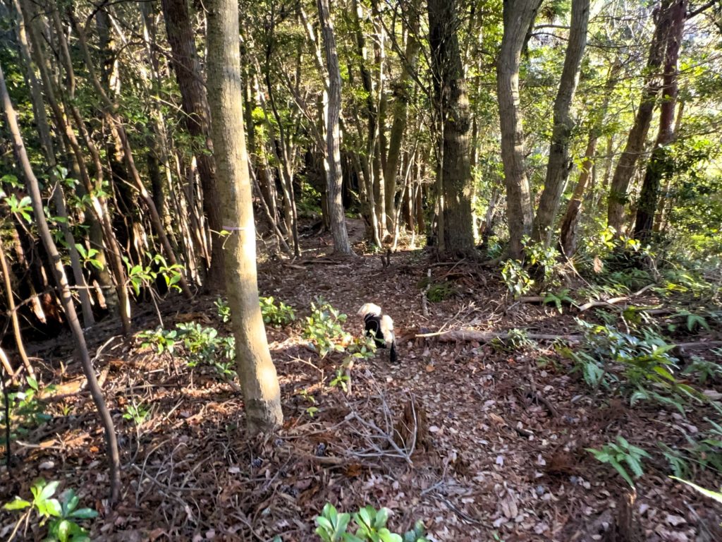 落ち葉が降り積もる鬱蒼とした森の中、登山道もハッキリしない個所があります。