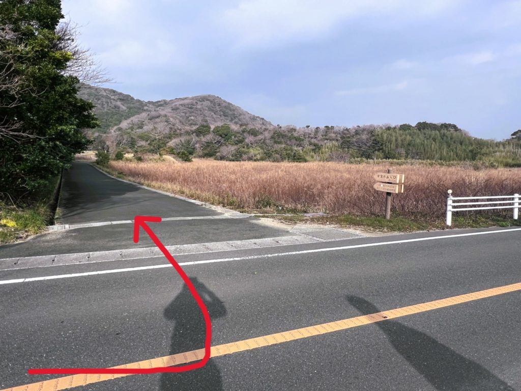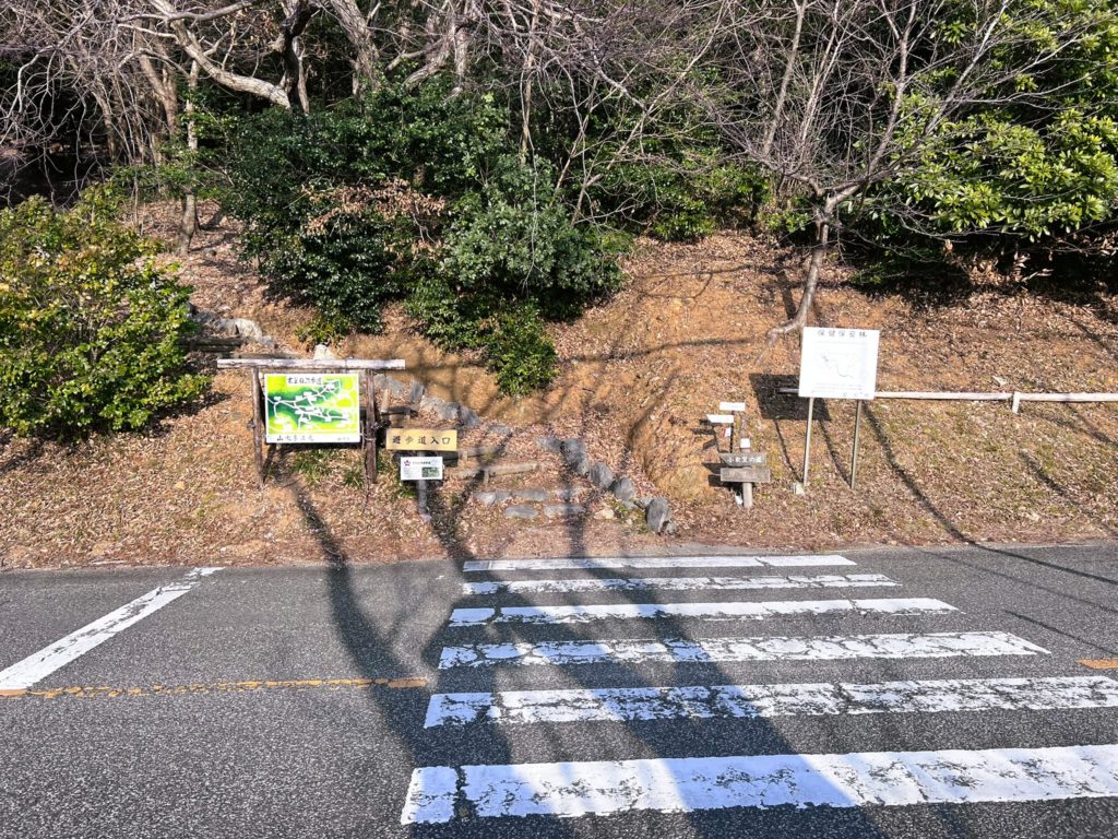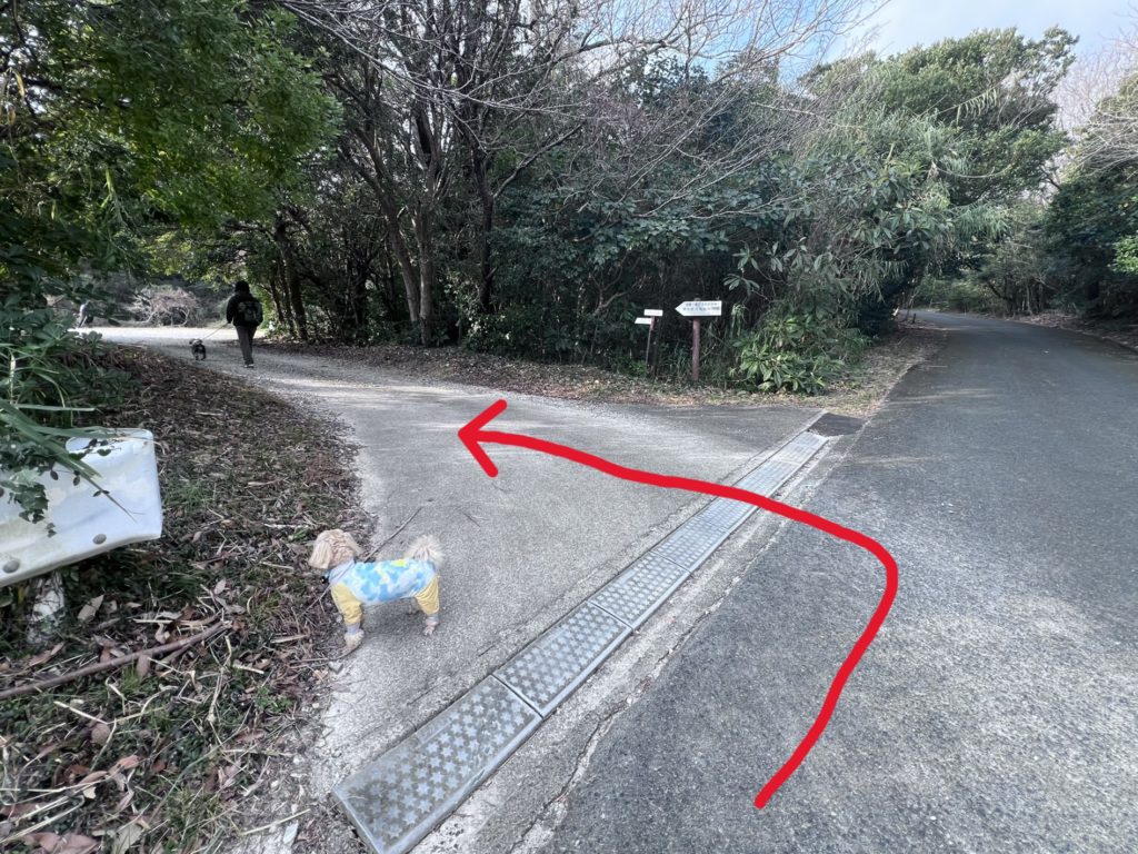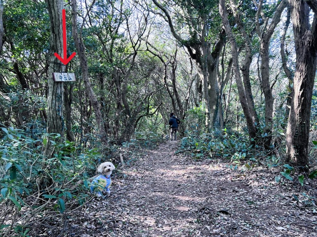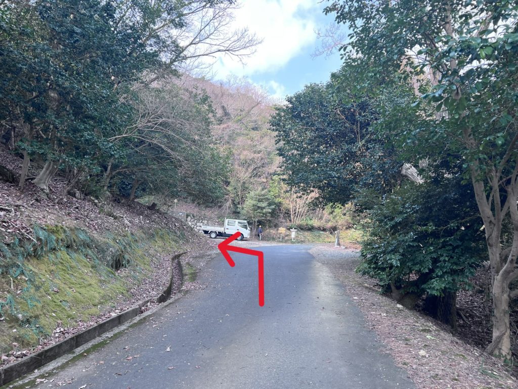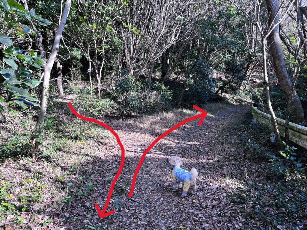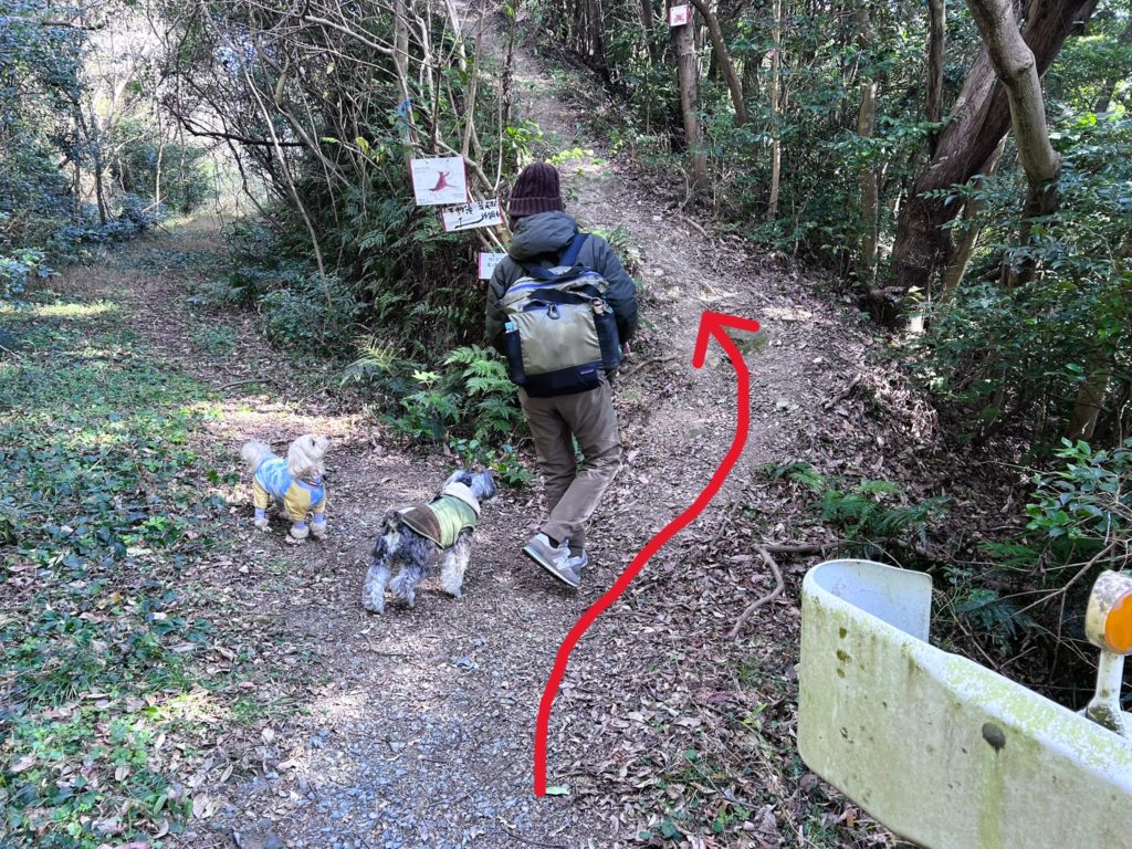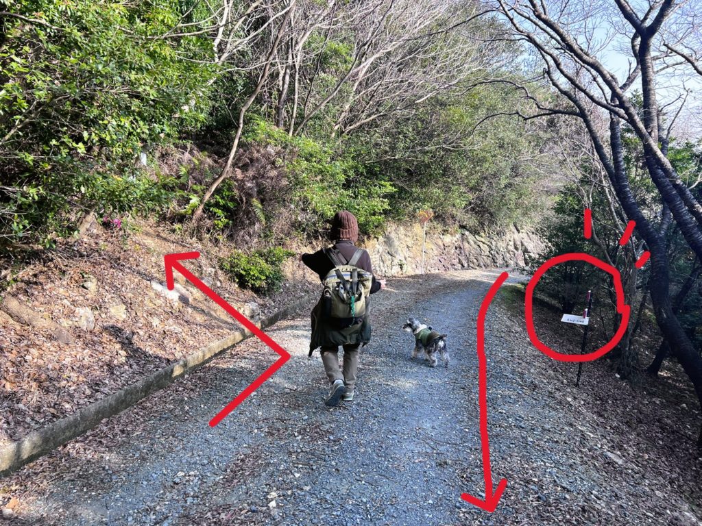 『目』の線を作り終わったら、車道まで戻らず案内板を左折し、山道へ入って行きます。
