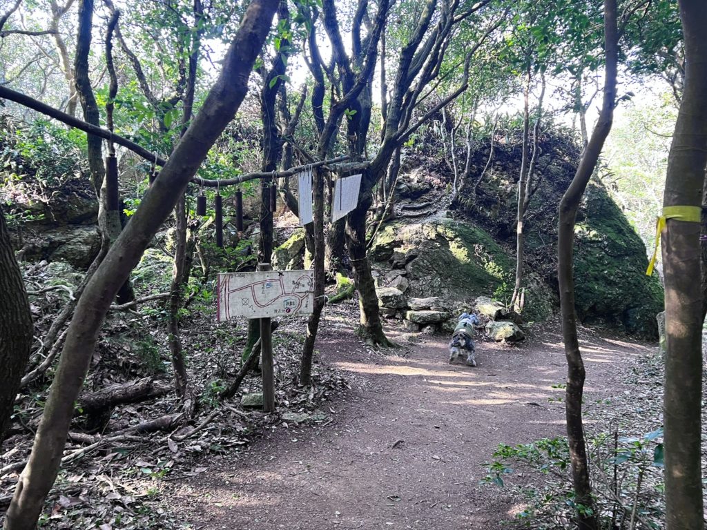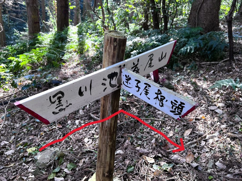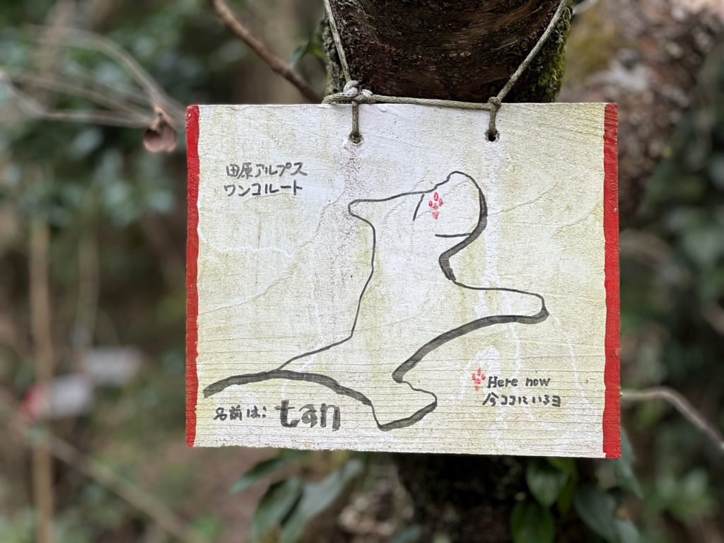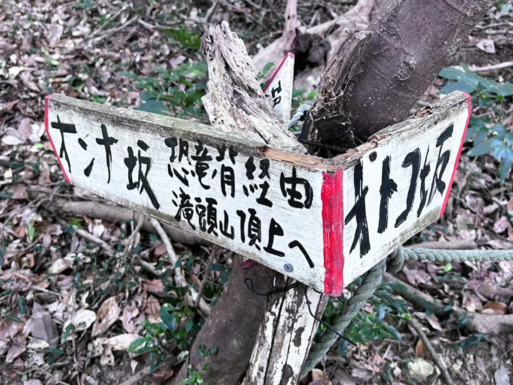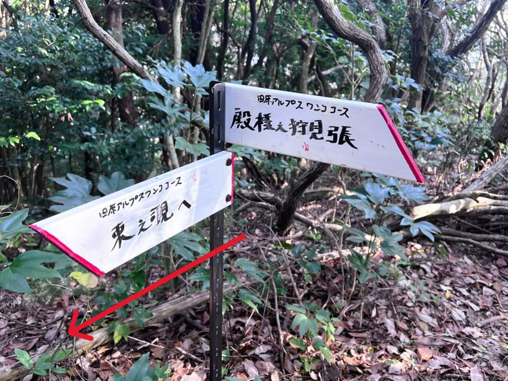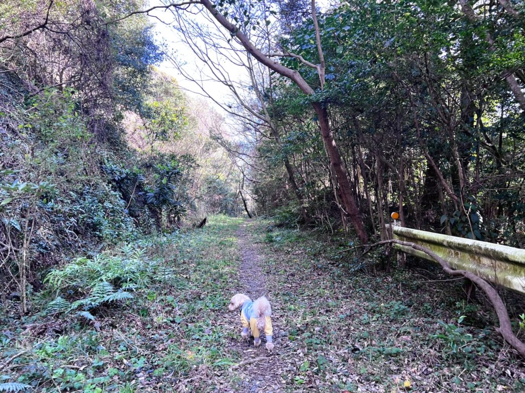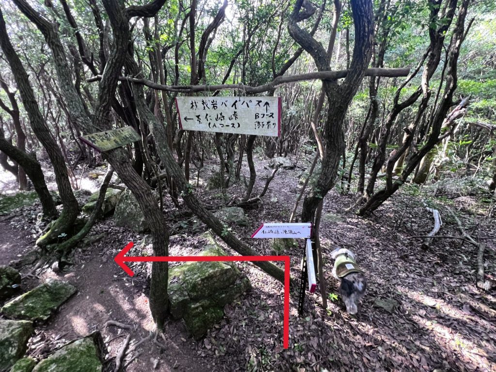 『目』の線を作り終わったら、車道まで戻らず案内板を左折し、山道へ入って行きます。