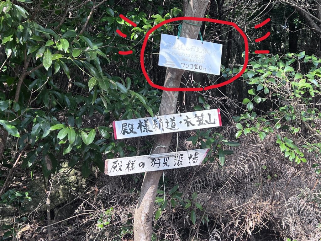 『口』の線を作るため『小衣笠の道』の看板から山道へ入り、右急カーブまでいってUターンします。