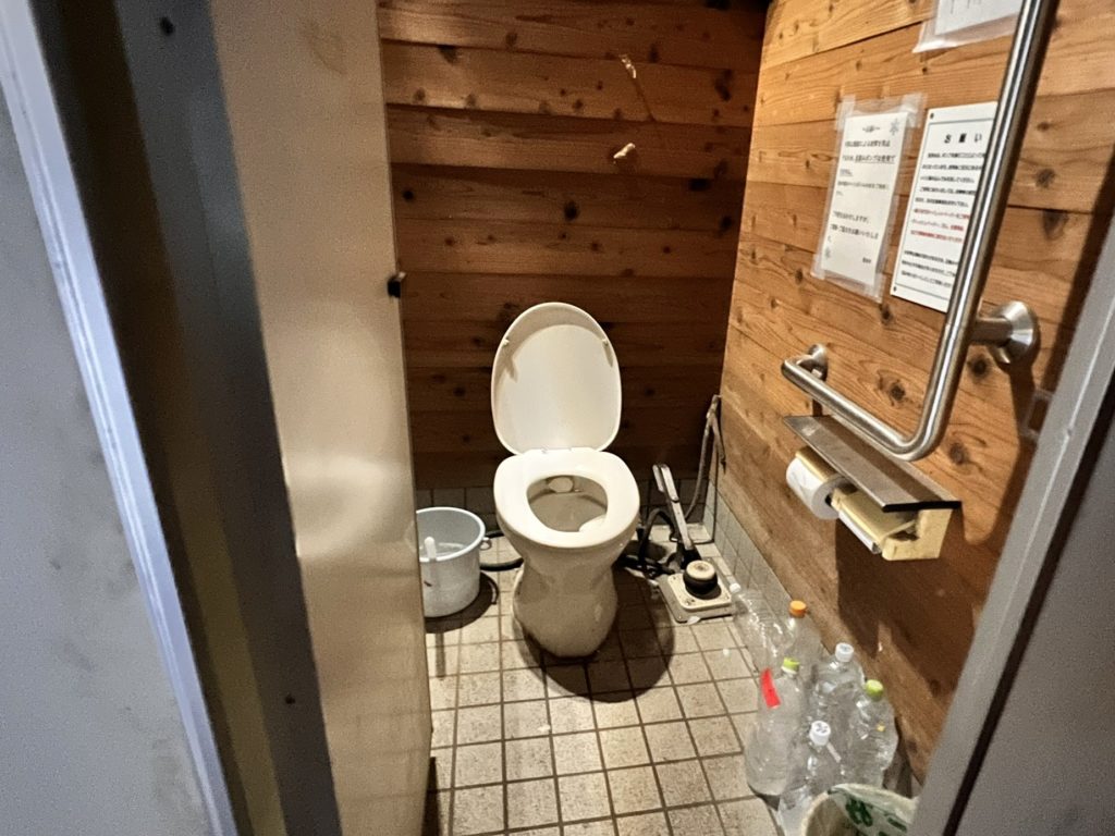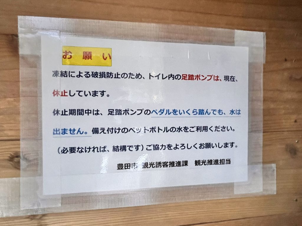 『足踏みポンプ式』のトイレですが、冬季は凍結による破損防止のため、備え付けペットボトルの水を自分で流して使用します。