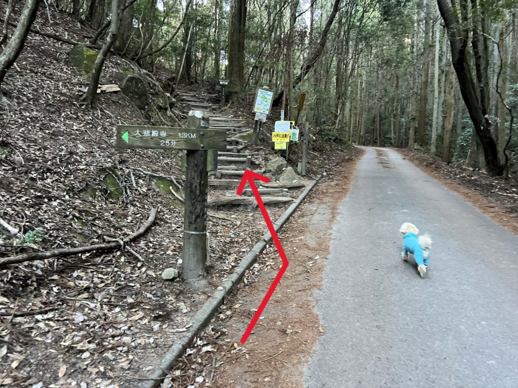 アスファルト道路を歩くこと22分、ようやくここから山道へ入って行きます。
