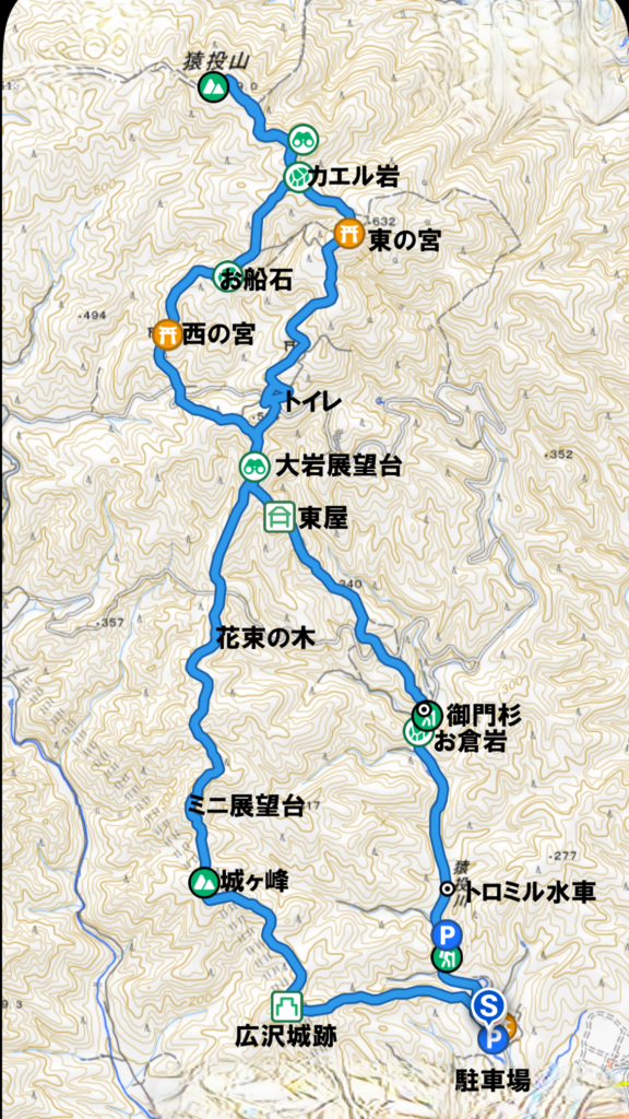 駐車場→東の宮→猿投山→西の宮→城ヶ峰→広沢城跡→駐車場