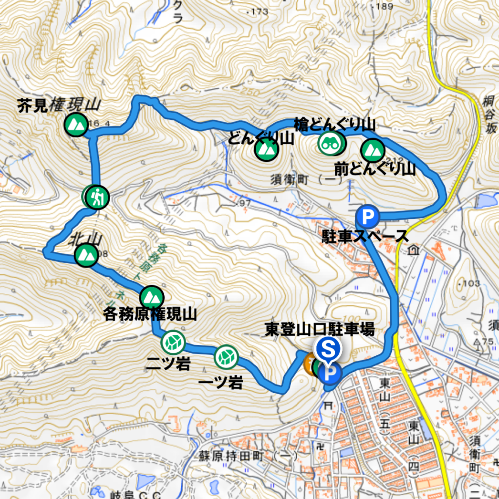 駐車場→どんぐり三山→芥見権現山→北山→各務原権現山→駐車場