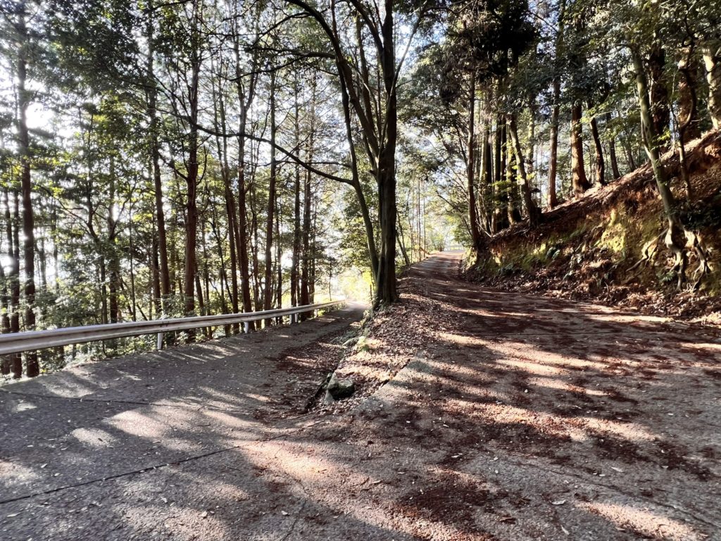 基本はアスファルト道路ですが、約30分進んだ地点に、山道に入るか、アスファルト道路を進むか、チョイスできるポイントがあります。