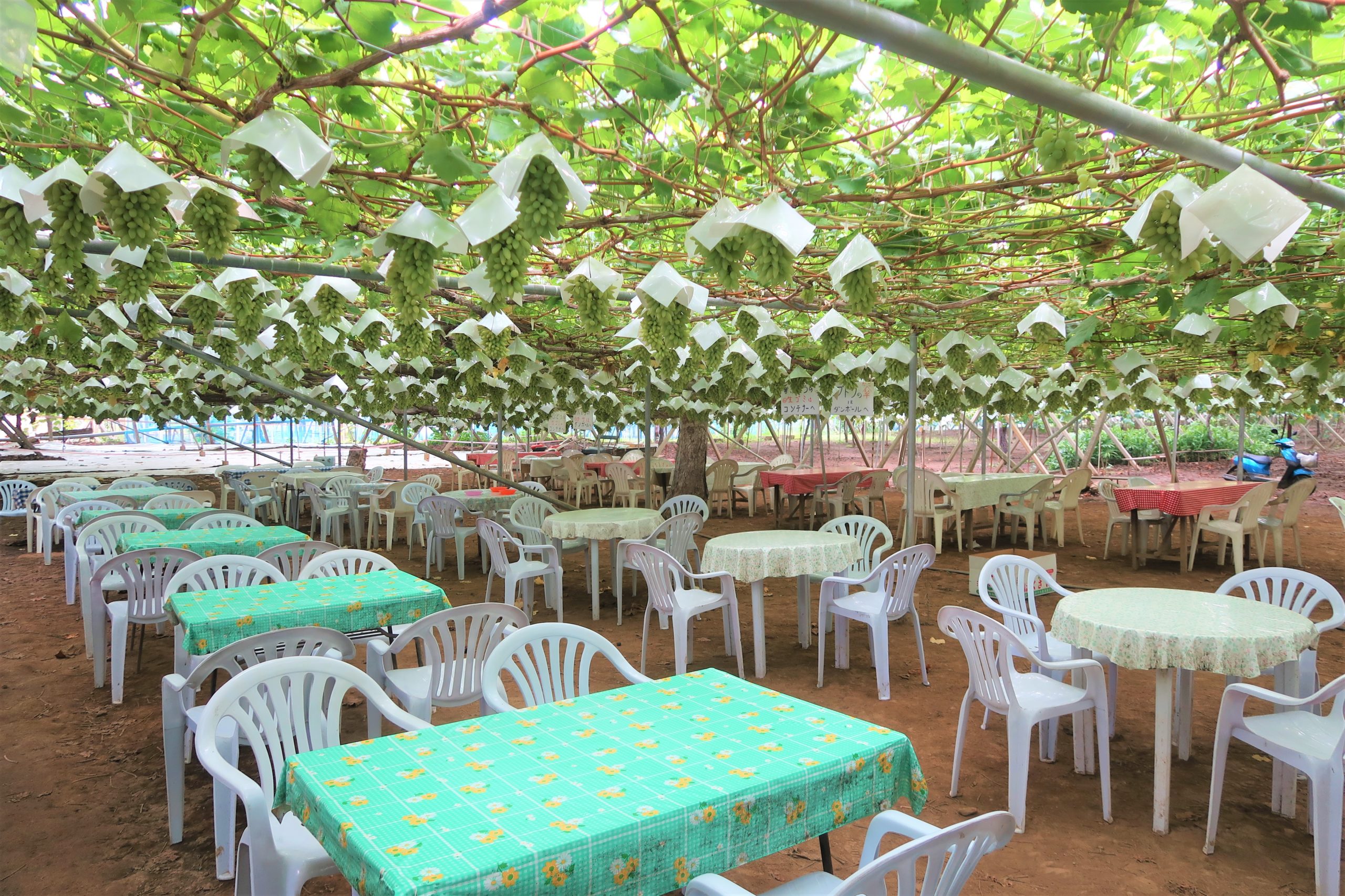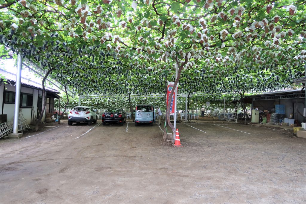 駐車場の様子。天井にもブドウがたくさん実っています
