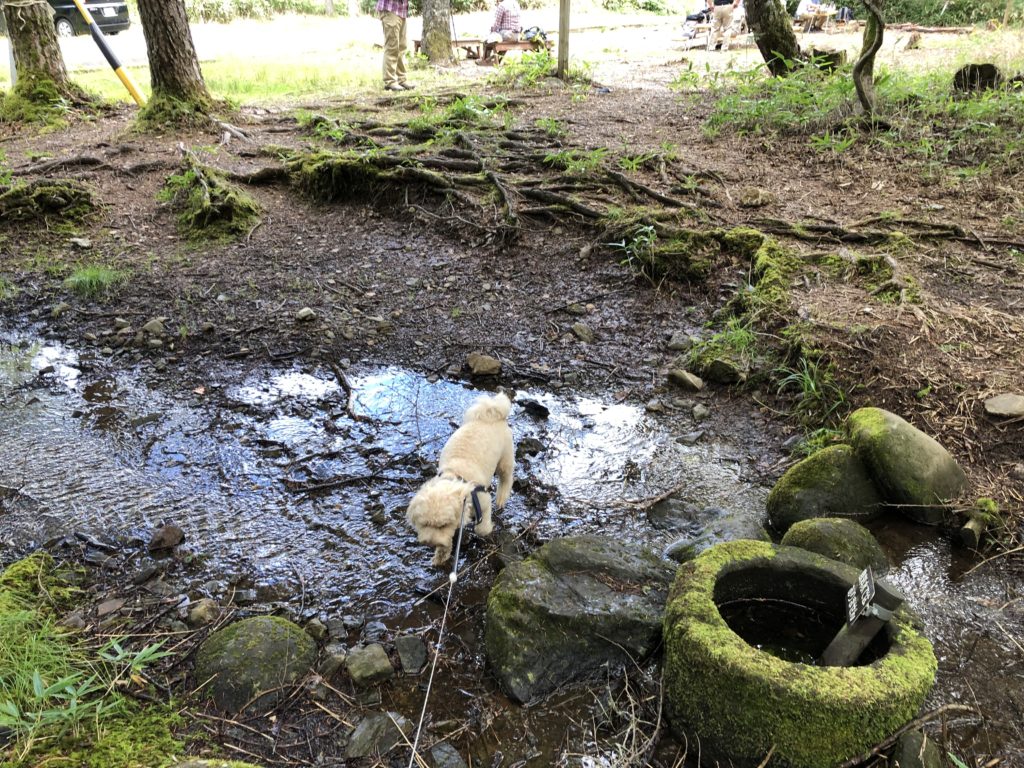 カゴメの森の湧き水が流れるきれいな川です。川があると入りたくなるエルモはとりあえず水遊び♪
