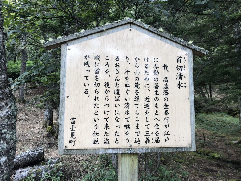 「首切清水」の名前の由来は、昔ここを通りかかった人が小川の水を飲もうとしたところ、後をつけて来た盗賊に首を切られたという悲惨な伝説からということです。