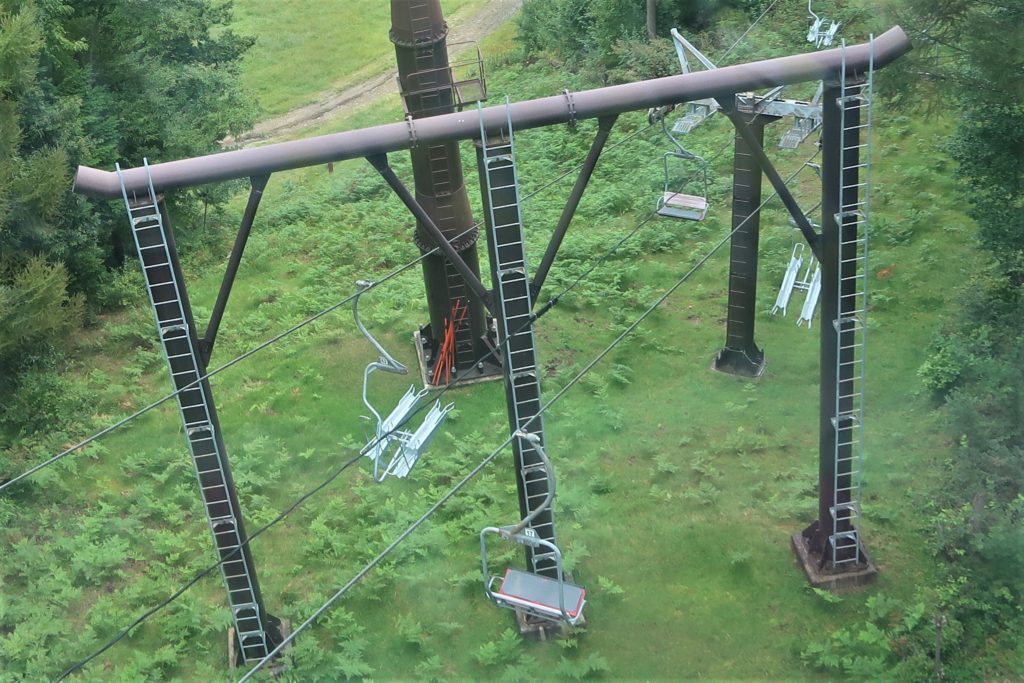 よく見ると人間用と自転車用のリフトが交互に吊るされています。ゴンドラでは自転車を室内に入れて運んでいましたが、リフトの場合はこれに載せて運ぶのですね(^-^)