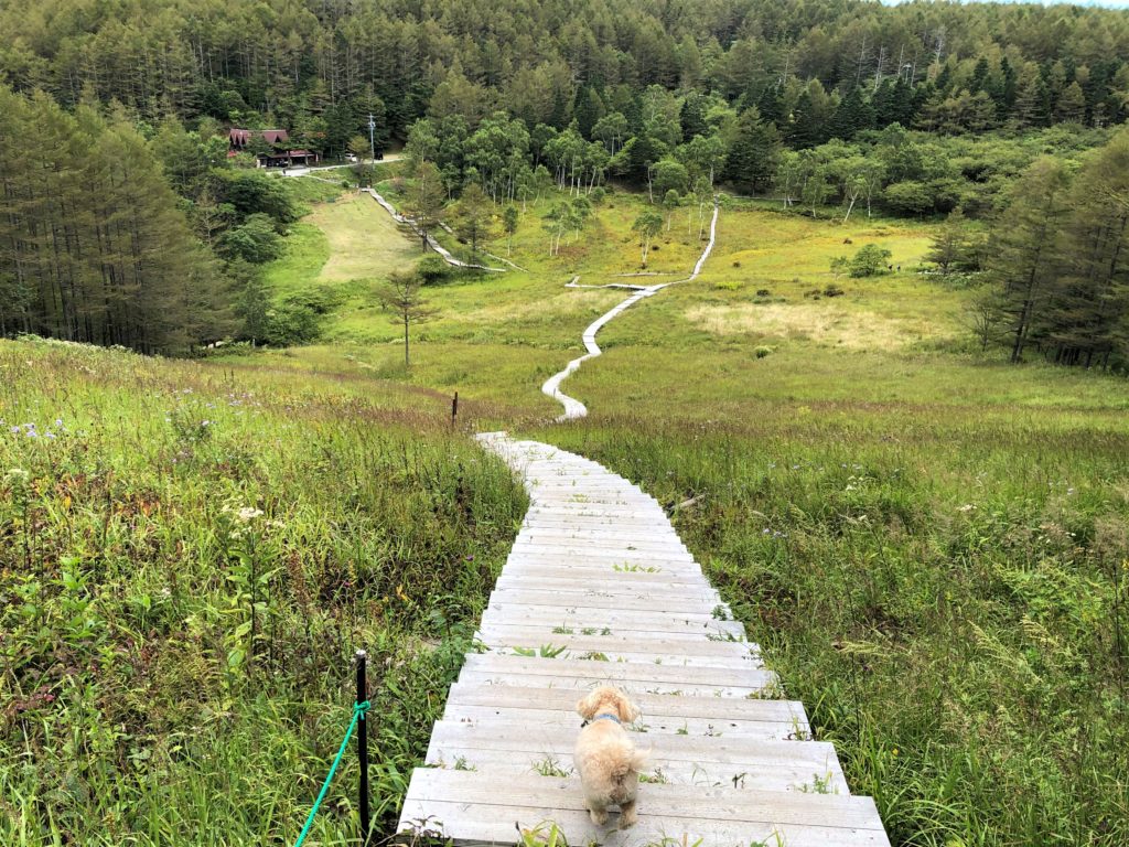 標高1,734mの入笠湿原の入口へやってきました。湿原を横断するように続く白い木道が印象的です。