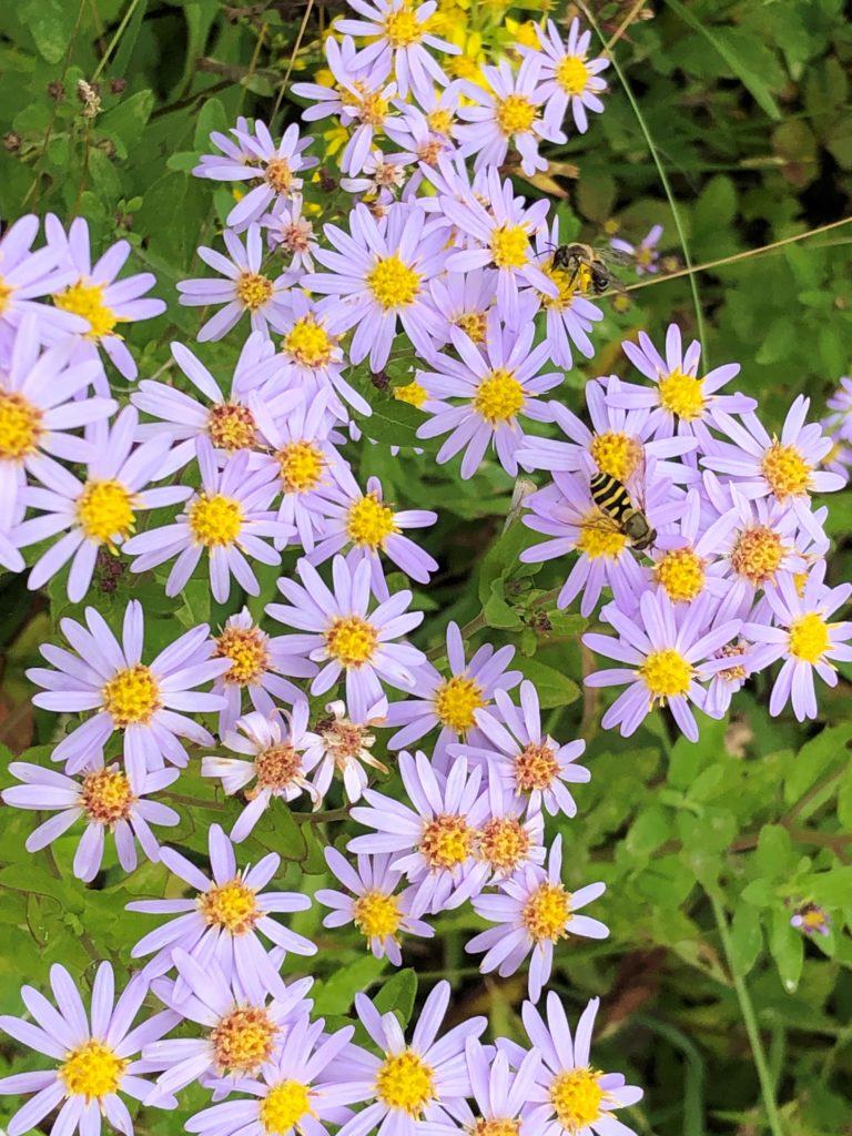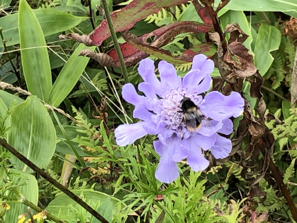 この時期あまり花の数は多くありません。それでもノコンギクやマツムシソウの鮮やかなムラサキが彩りを添えてくれています。夏の終わりだというのに、花から花へ元気に飛び回る蜂の姿も見られました。