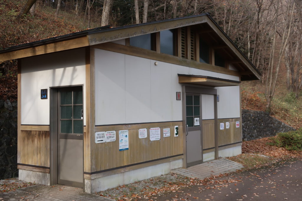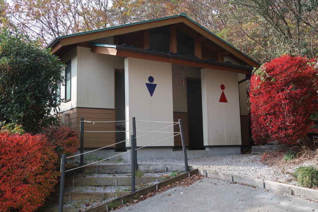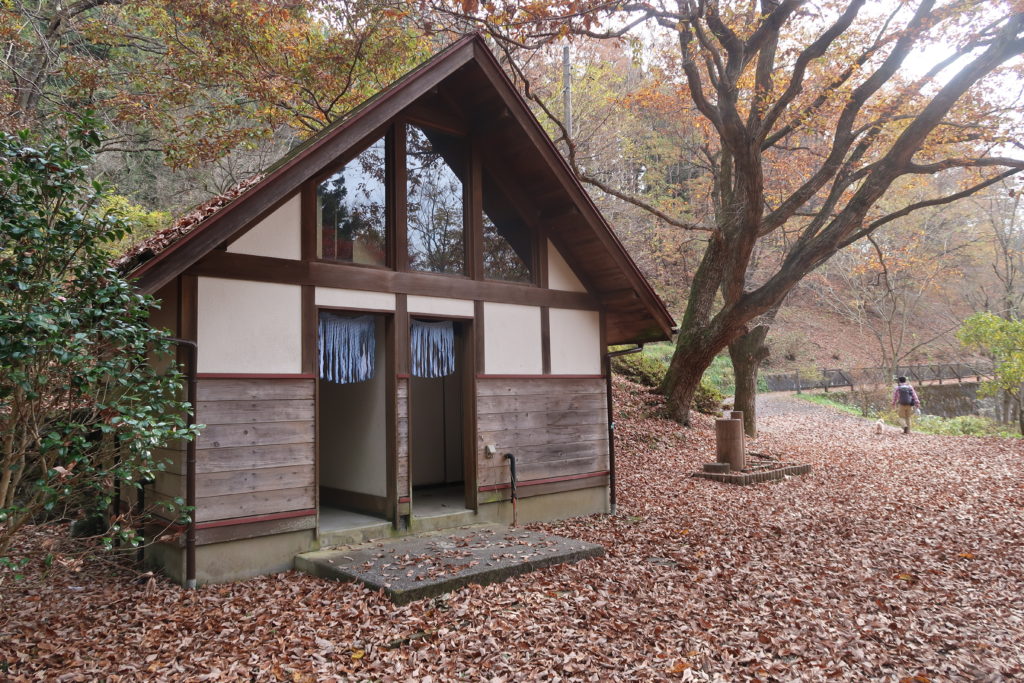 5分ほどふかふか落葉のトレイルを下って行った先、一般道と合流する分岐点にトイレがあります。