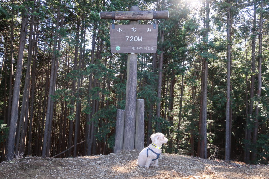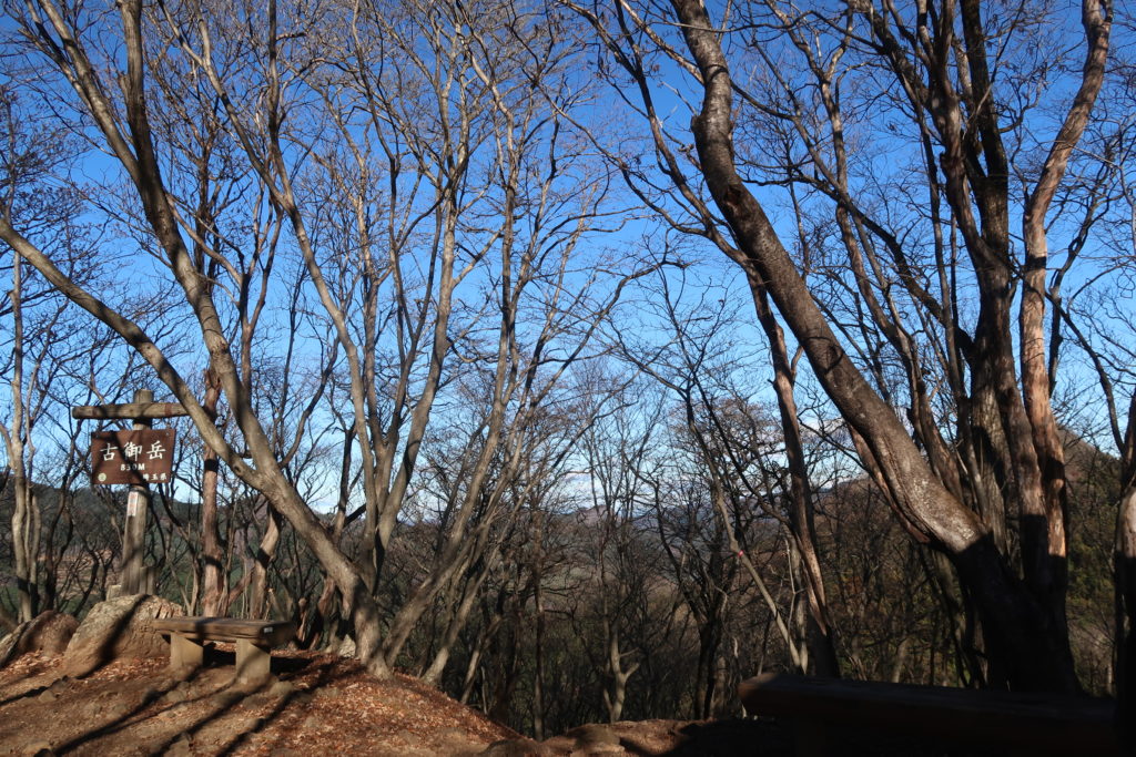 山頂の標柱が立っている場所は、木に囲まれていて眺望もあまり良くありません。スペースも狭いので写真だけ撮って、次の目的地「古御岳」を目指しましょう。