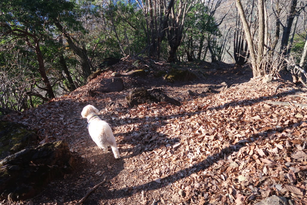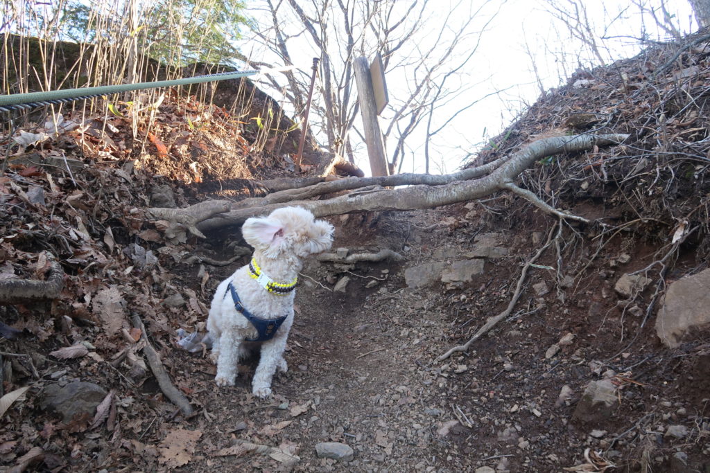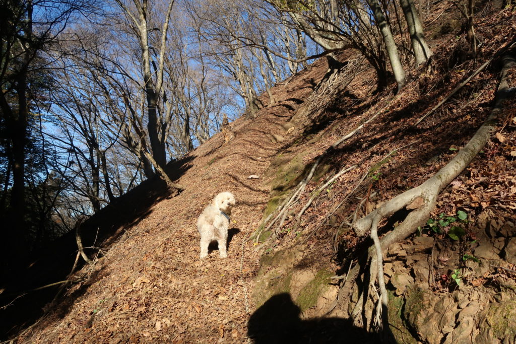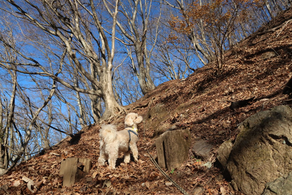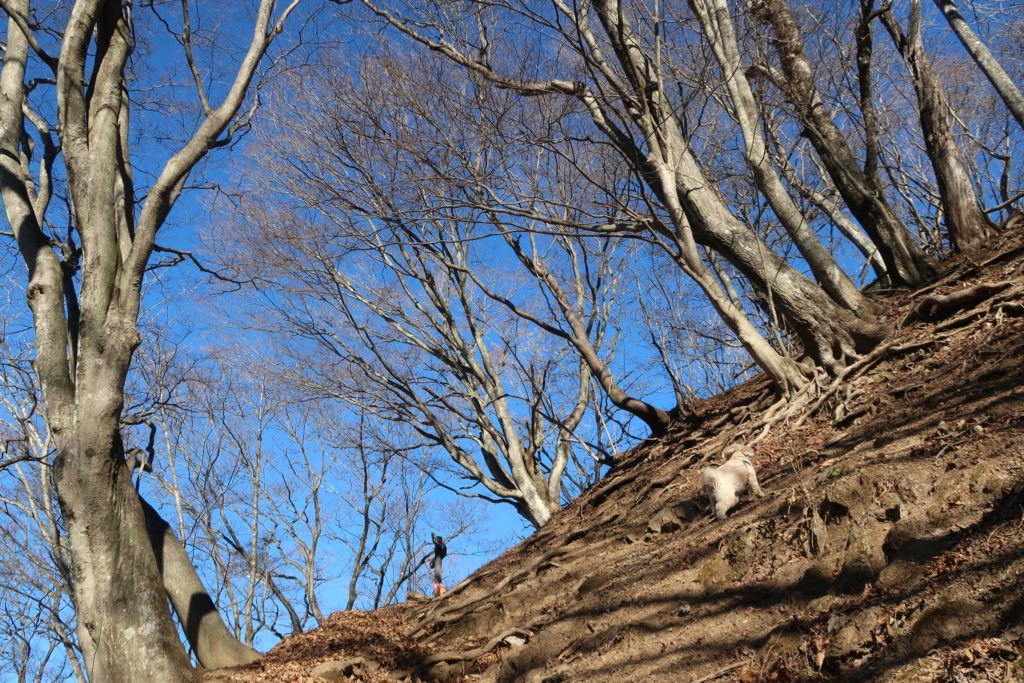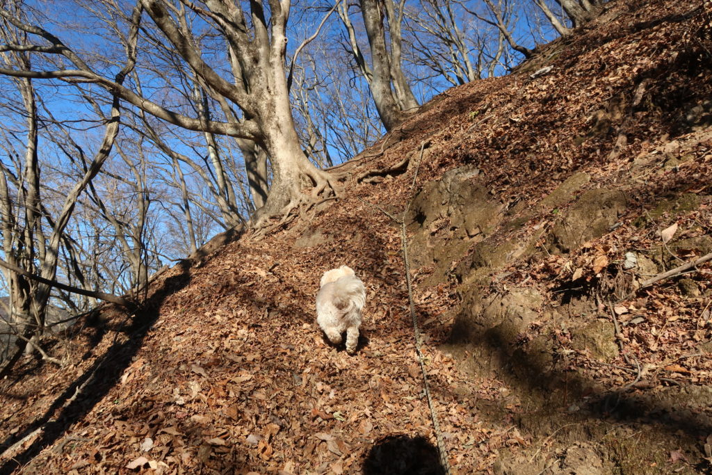 「伊豆ヶ岳」まで約30分、今来た上り下りを戻っていきます。結構な急斜面ですが、エルモはまだまだ元気なようです。