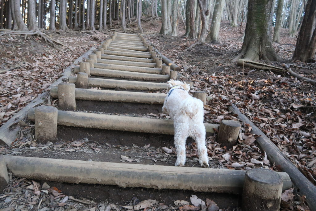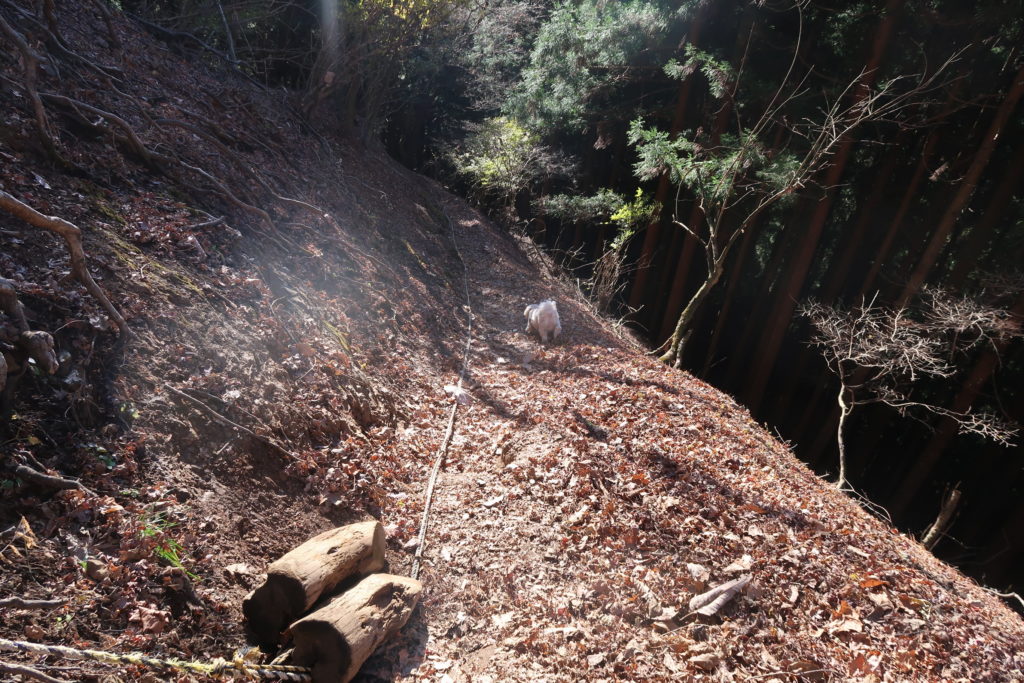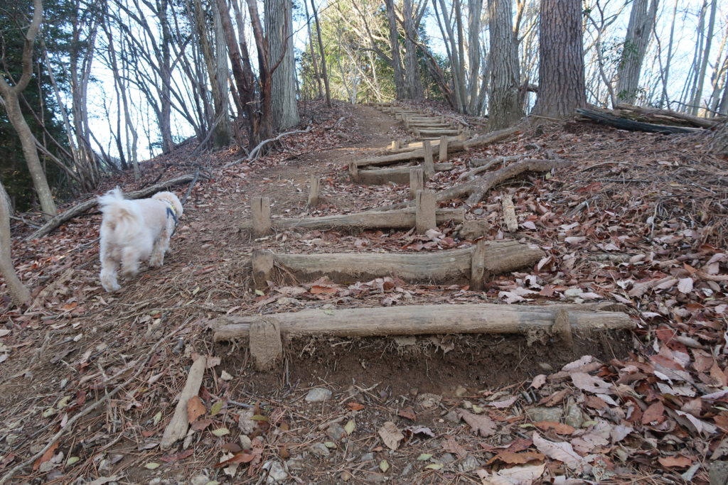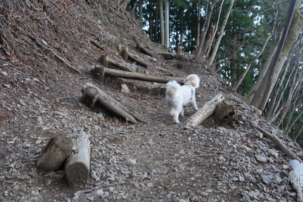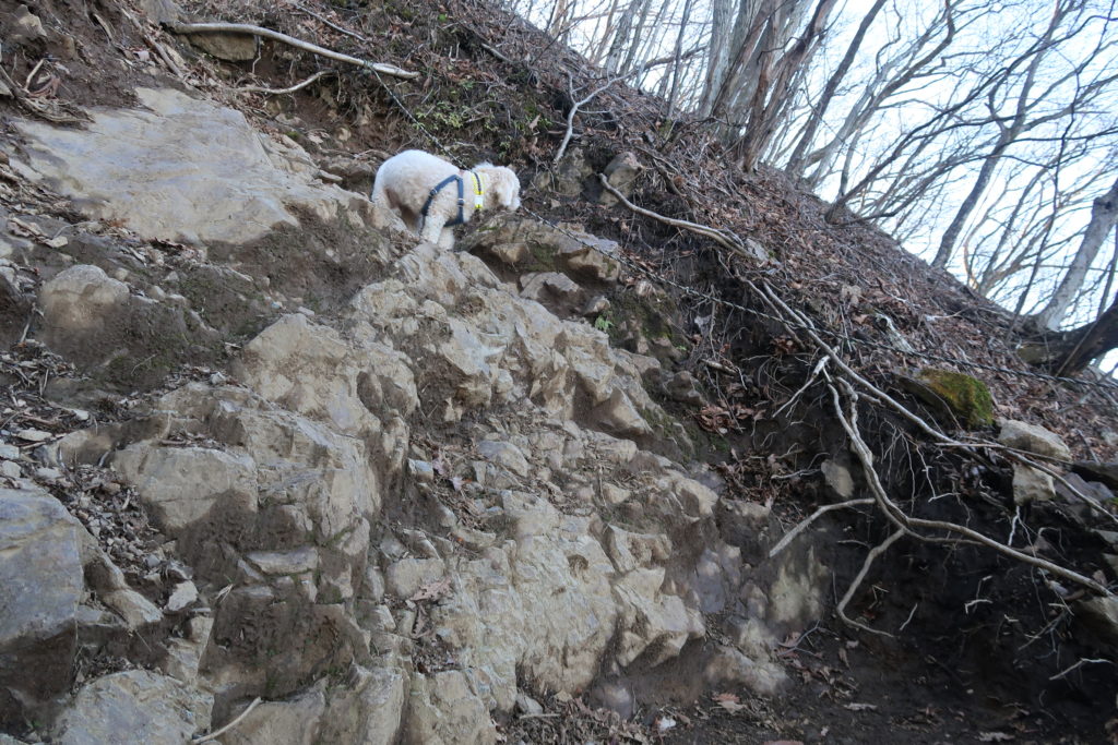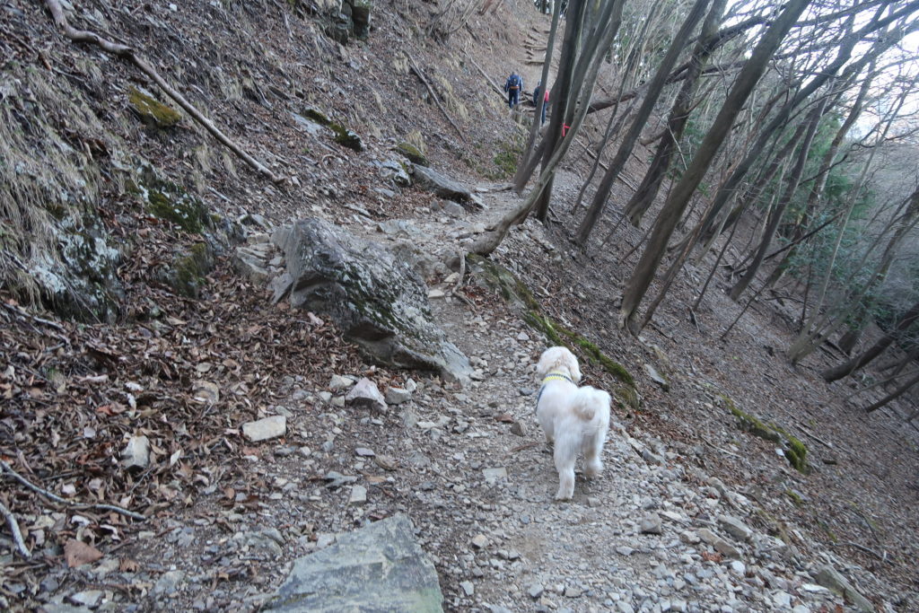 「伊豆ヶ岳」まで約30分、今来た上り下りを戻っていきます。結構な急斜面ですが、エルモはまだまだ元気なようです。