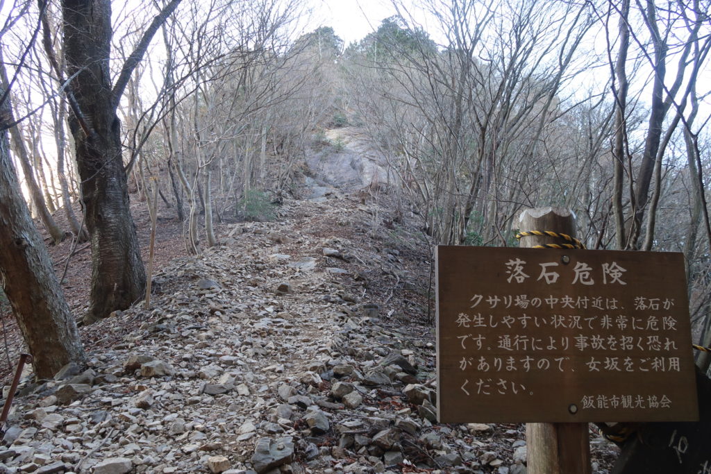 この先が「クサリ場」となります。落石も多く危険なようです。岩場の途中からは、木々に遮られることなく素晴らしい眺望が望めるのですが、犬を連れては無理なので今回は「女坂」ルートで山頂を目指します。