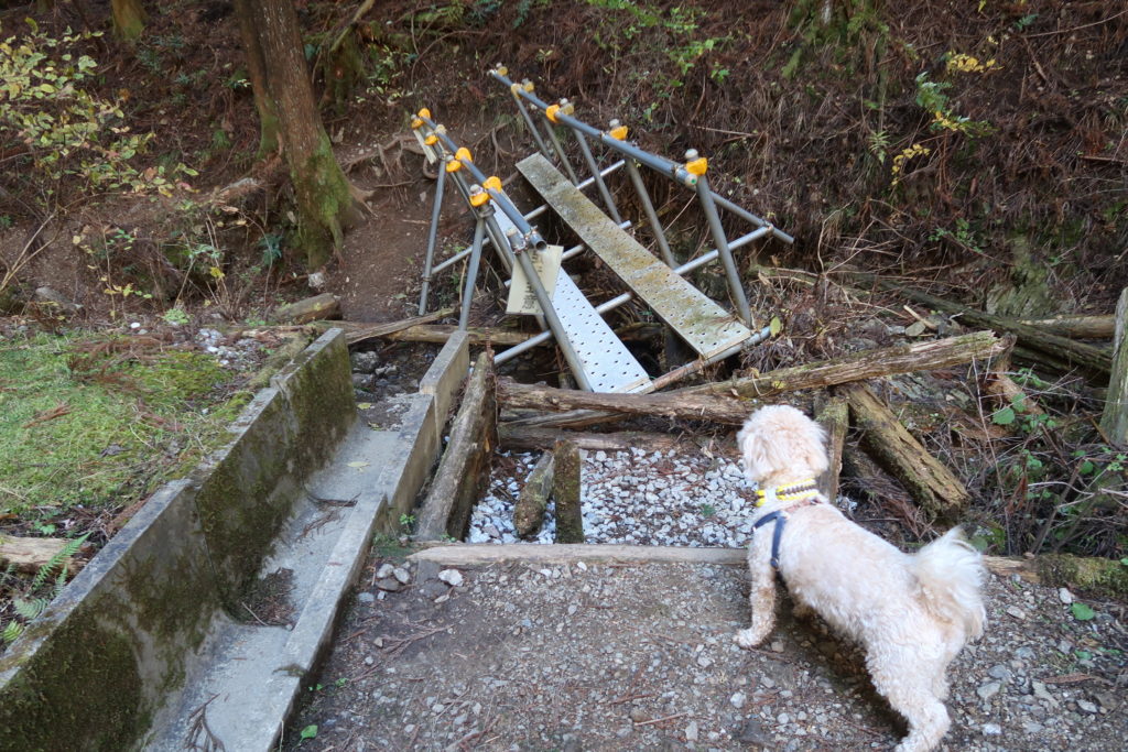 橋が架かっているものの、ワンちゃんには通れないものばかり。しかも抱っこで橋を渡ることも難しいので、流れがゆるく浅い場所を見付けて川を渡ることになり、エルモもお腹まで水浸しになりながら進みました。