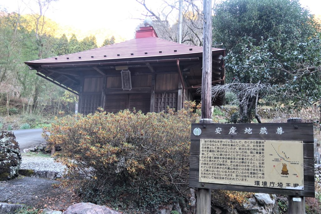 しばらく進むと「安産地蔵尊」がありました。金の胎内仏を持っている仏様として崇められ、大蔵山地区ではお産によって命を落とす人はいないと言われているそうです。