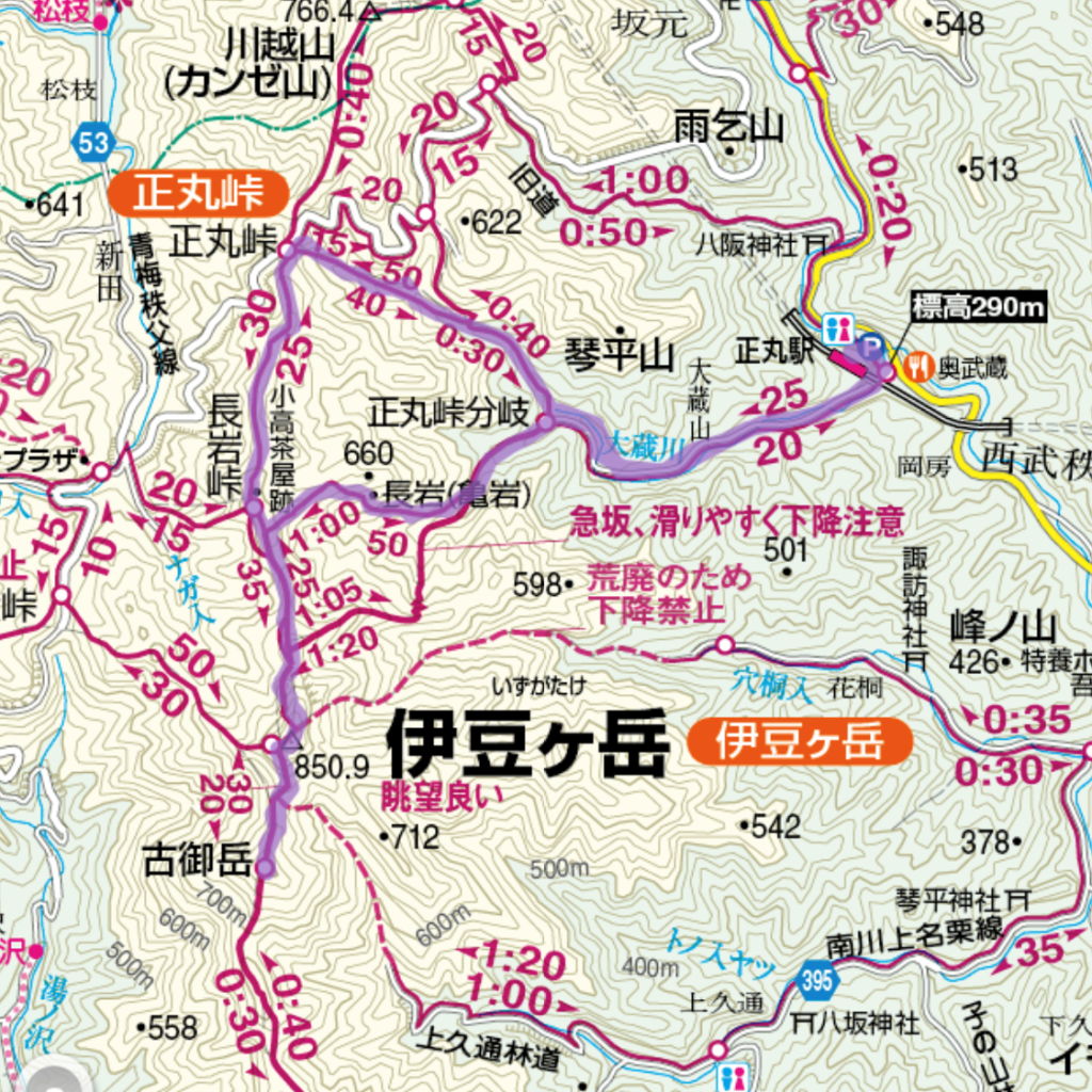 正丸駅から長岩峠を経て伊豆ヶ岳、その先の古御岳まで行き、帰路は正丸峠を周って下山するコースを紹介します。