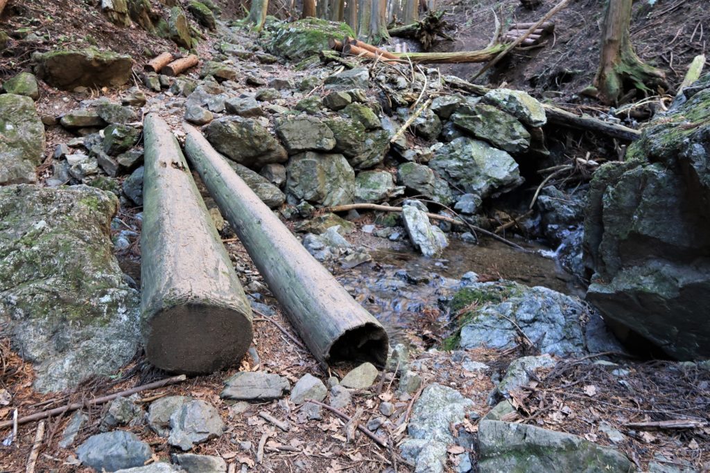 「正丸峠」からは、しばらく急な下りとなります。その後は、川沿いの道をいくことになるのですが、ところどころ登山道にも水が流れている個所がある上、何度も川を渡ります。