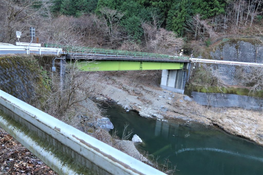 きみどり色の橋が見えてきました。渡ったところが登山道入口です。