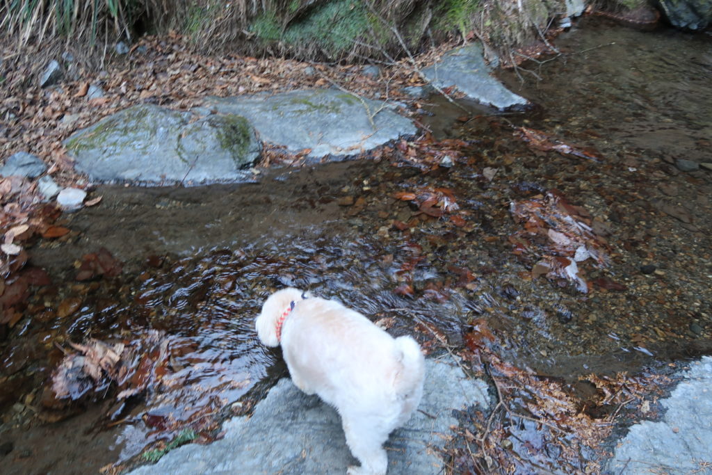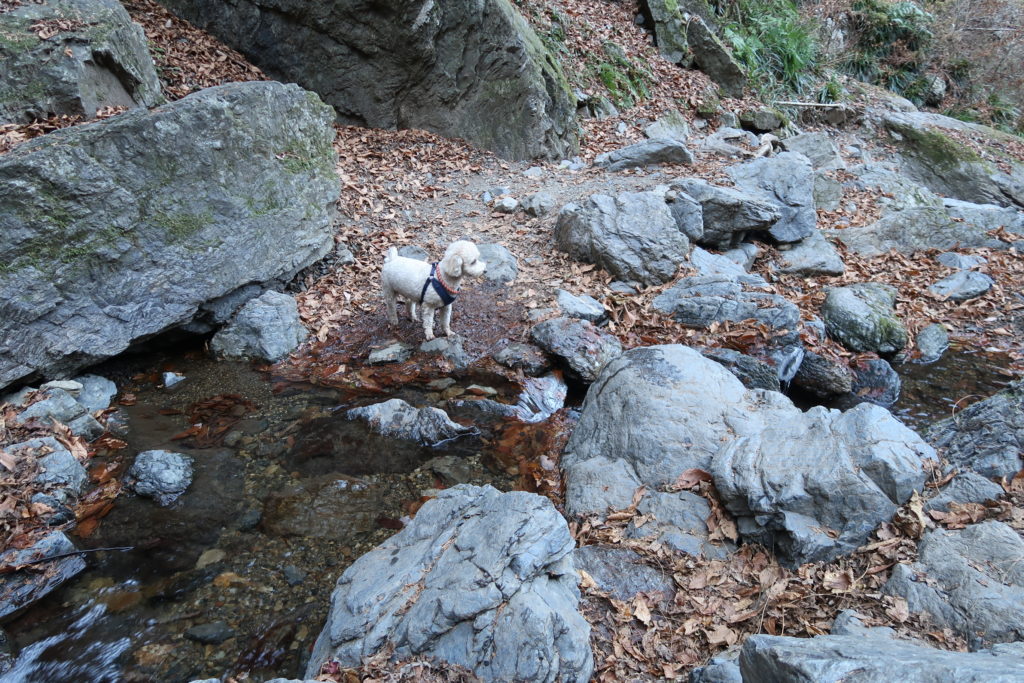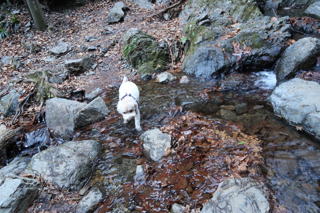 この時は、晴天続きで水量も少ない方だと思いますが、エルモは人間のように岩を選んで渡ることができないので、川に入って渡るしかありません。