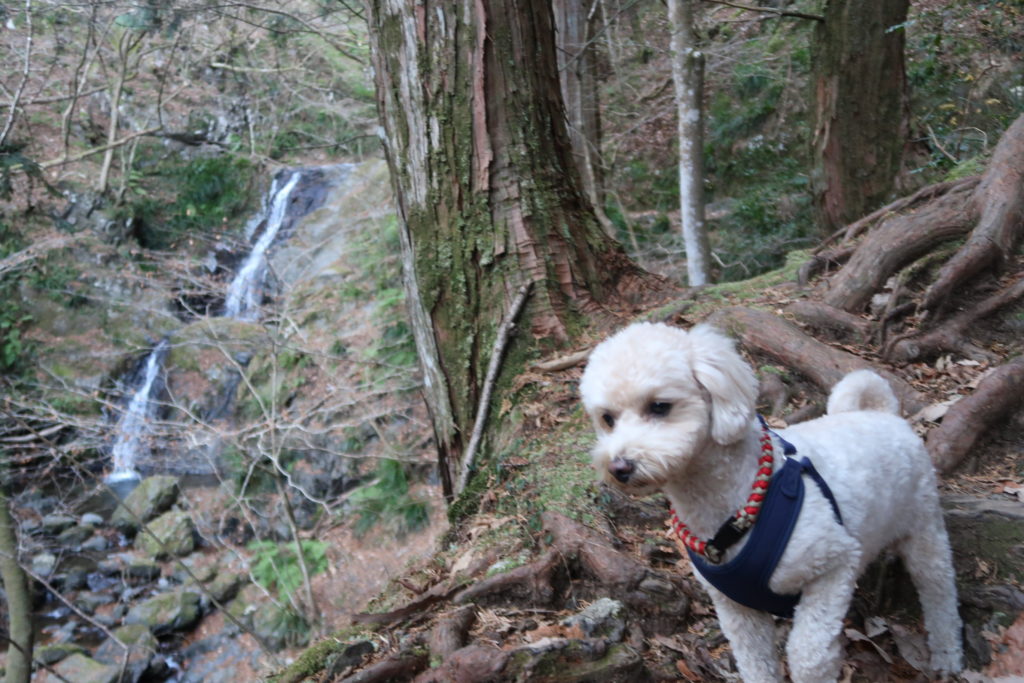 「白孔雀の滝」という美しい名前の滝。エルモはまだ恐怖に怯えているのか、めずらしく尻尾が下がっています。トラウマにならないといいけど…