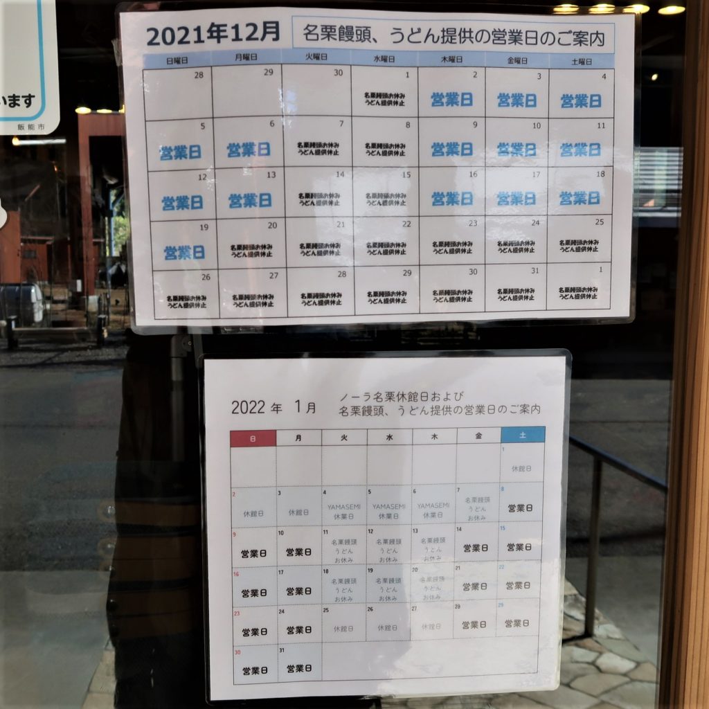 通常、土日祝日は営業しているようですが、平日の休館日、うどんや饅頭がない日など、「ノーラ名栗」のHPなどで事前に確認した方が良いでしょう。