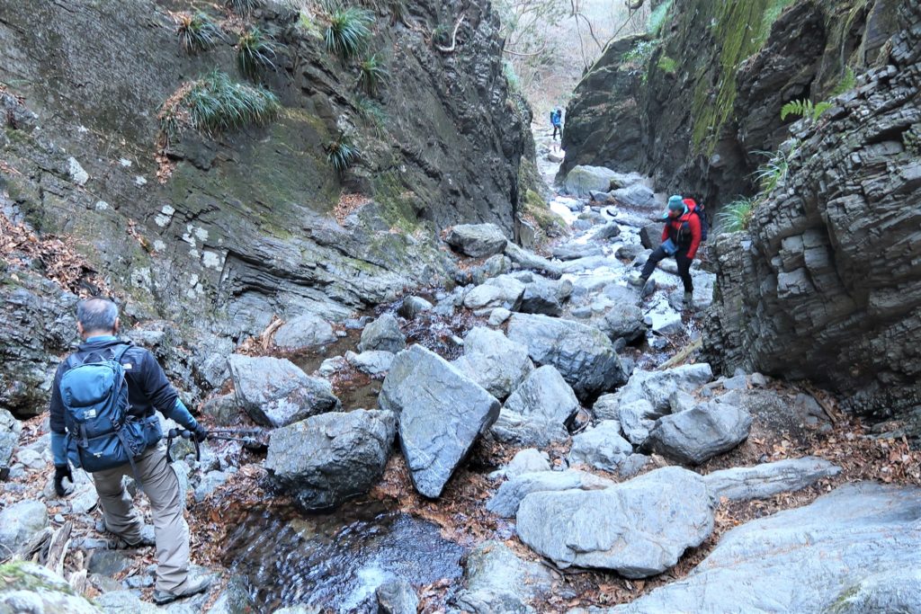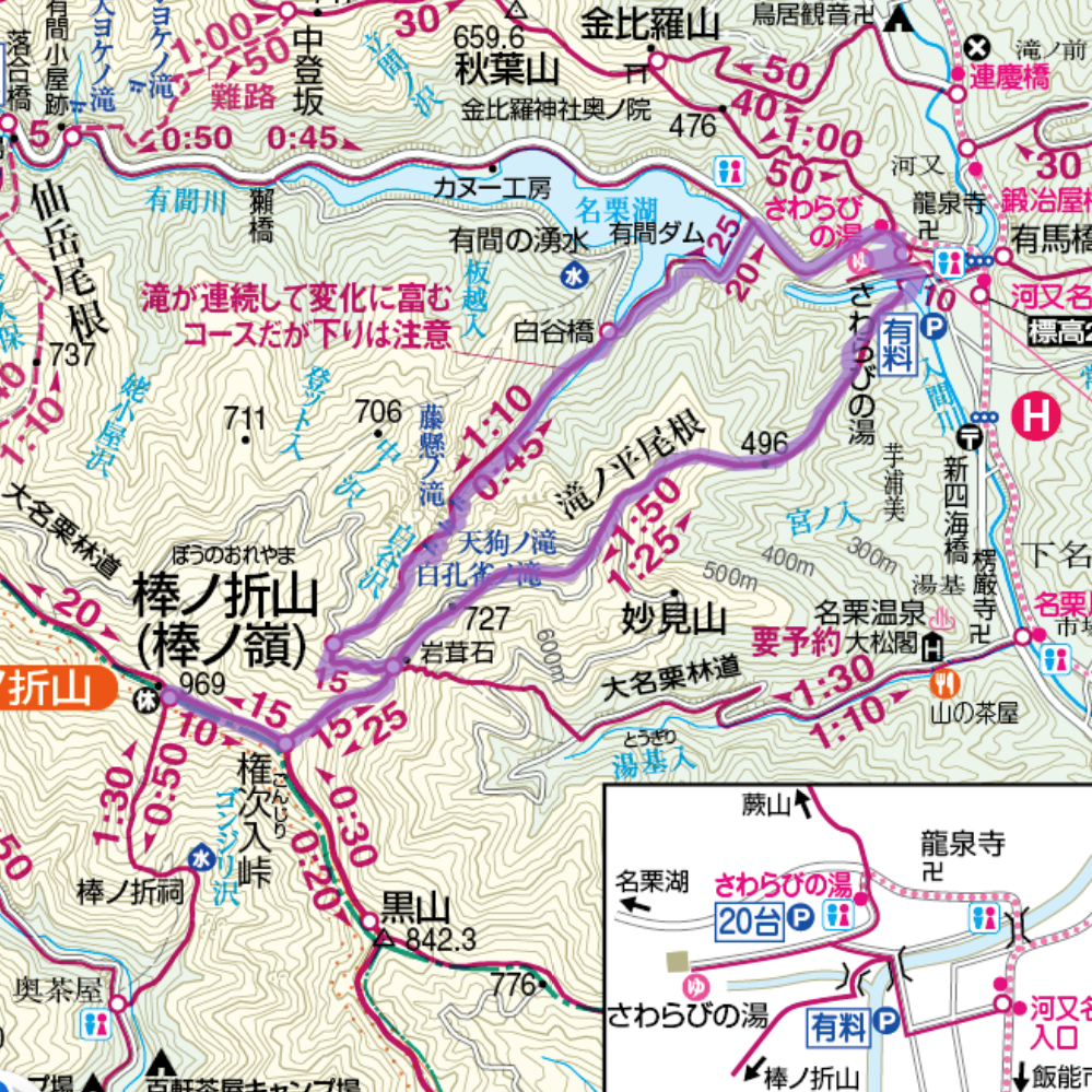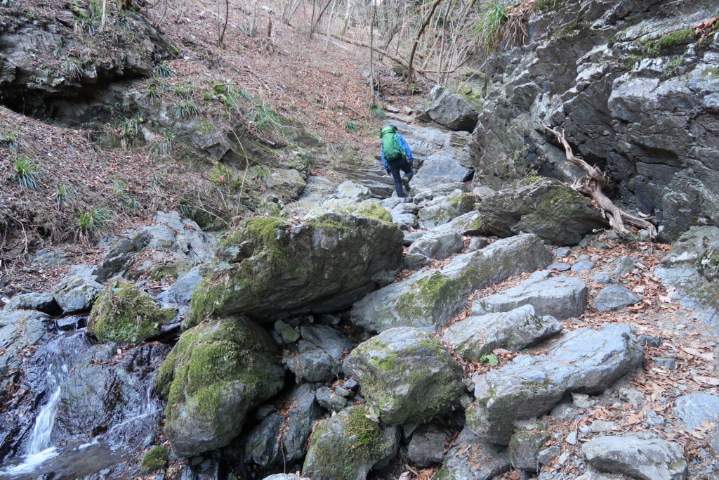 「さわらびの湯」駐車場を利用した場合、約2時間30分ほど。名栗湖の有間ダムより白谷沢沿いに登るルートと、滝の平尾根ルートの2つがあり、沢登りと山歩きの両方を楽しめるバラエティに富んだコースとなっています。