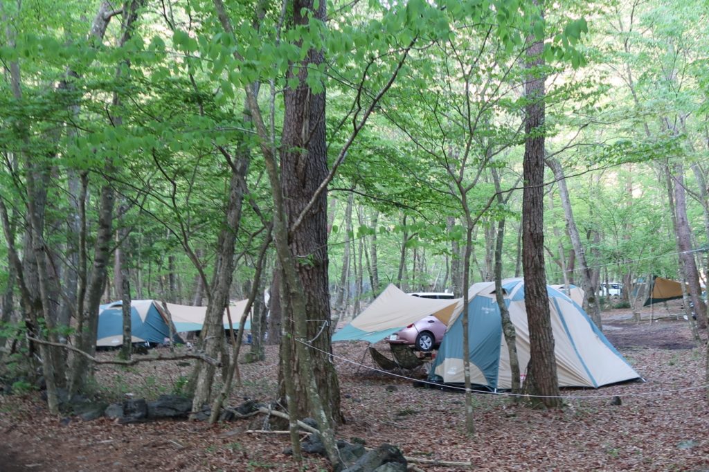 キャンプ場内の通路を歩いていると、登山道への案内板があちらこちらに現れるので、迷うことなく進めます。登山コース中にトイレはありませんので、こちらでお借りしていきましょう。