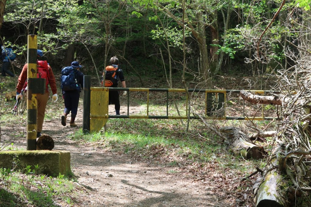 案内板に沿って進んで行くと、黄色いゲートがありました。ここが登山道入口です。