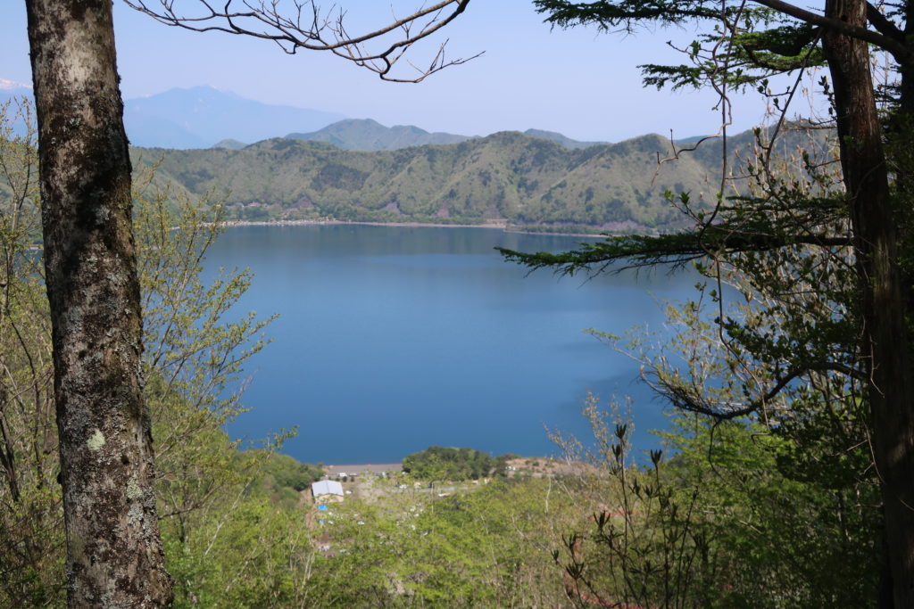 まあるい竜ヶ岳の山頂が見えています。湖に住んでいた竜が駆け上ったとされる伝説を持つ竜ヶ岳ですが、その山容は緑のモフモフ。やさしいイメージです。