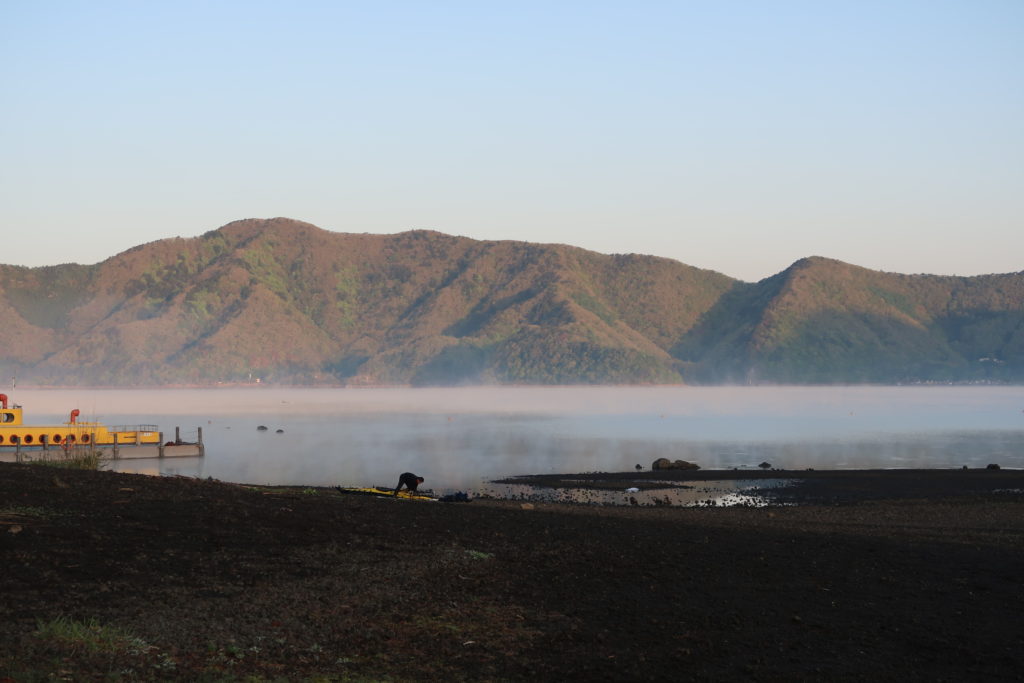 登山口までは、10分ほどです。朝靄がかかる本栖湖を背にキャンプ場へと入っていきます。