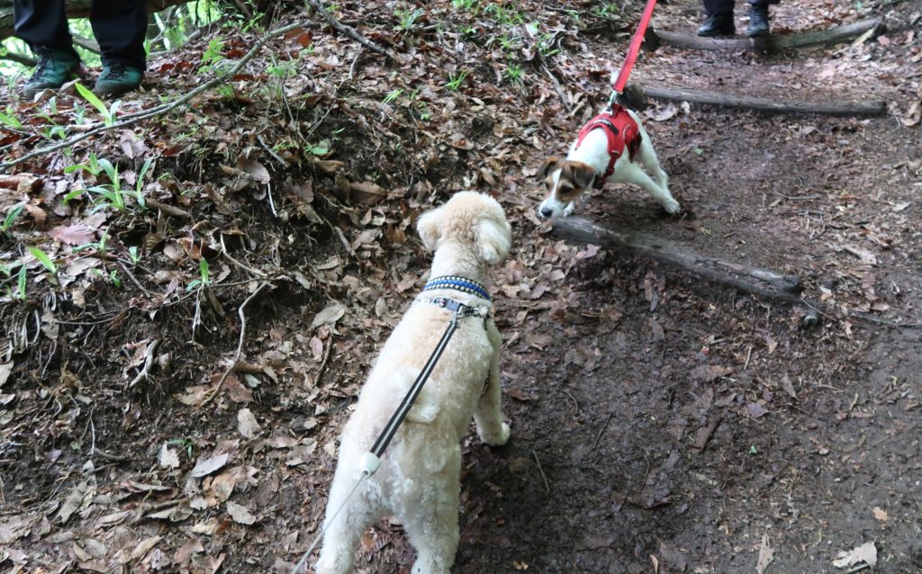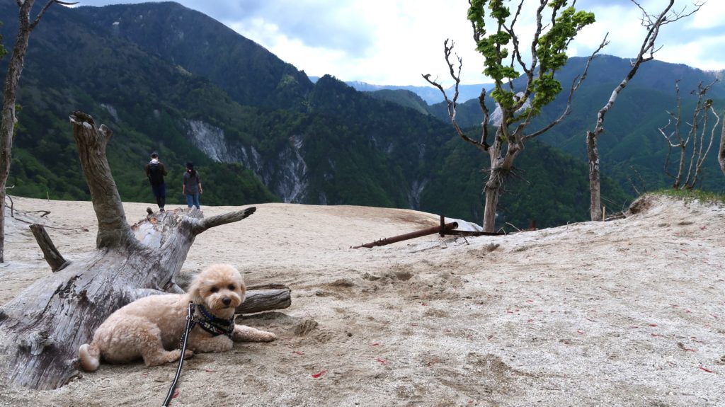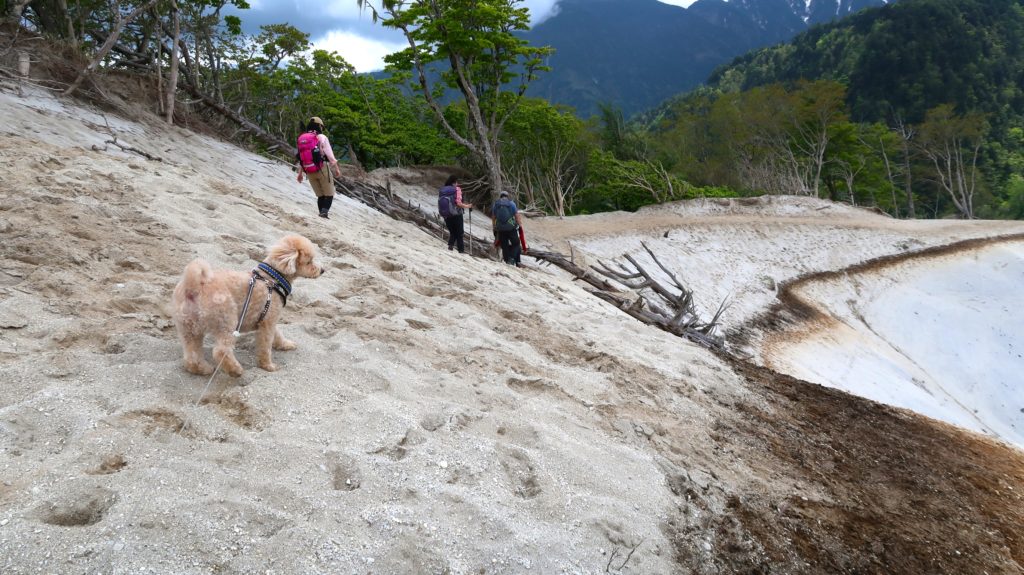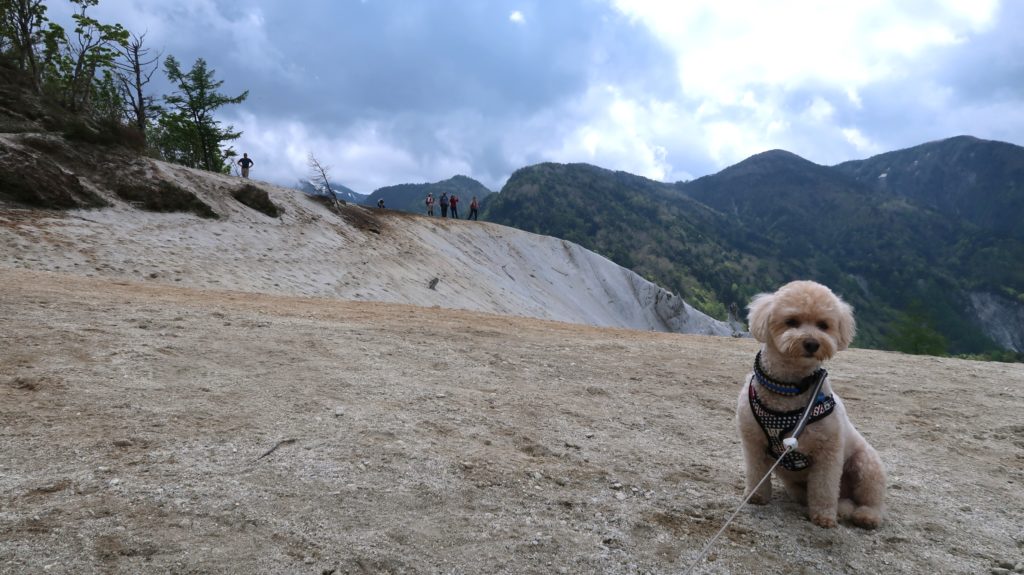 向かい側からワンちゃんもやってきました。登山を終えたジャックラッセルテリアちゃんです。