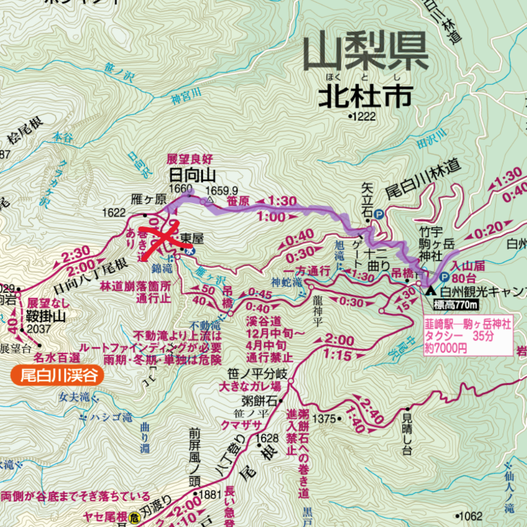 標高1,660m。山梨県北杜市に位置し、尾白川渓谷の駐車場から約2時間30分。